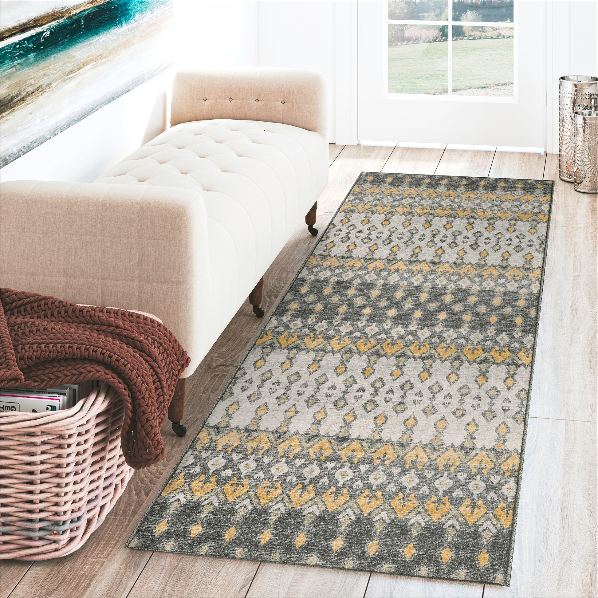 Easy care. Machine Washable. Larger rug sizes may not fit into a residential washing machine. They may be washed in a commercial size washing machine or hosed-off outside with mild soap and water. Air-dry, do not machine dry. Vacuum (without a beater bar), shake out or sweep regularly.