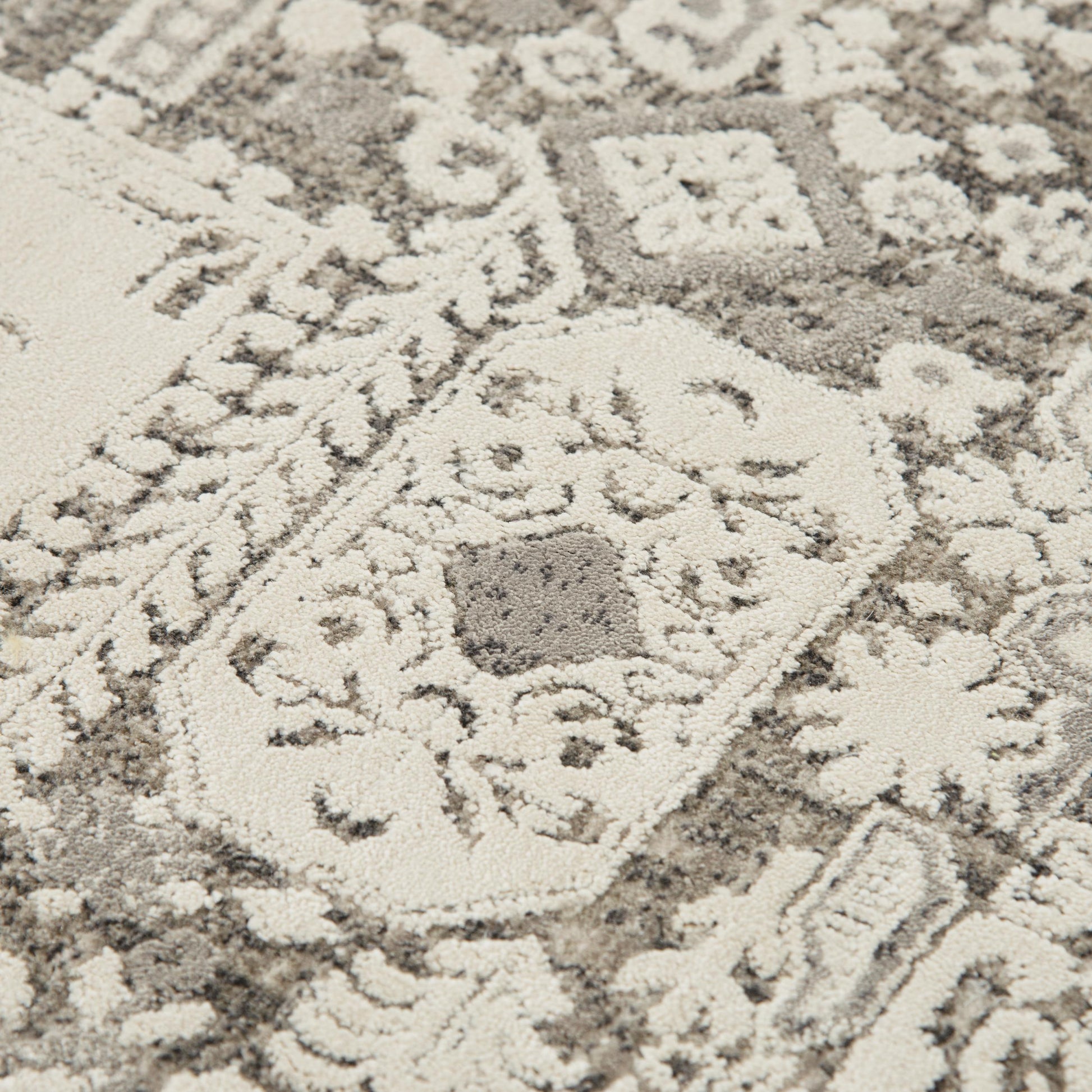 Collectors of fine antiquities will cherish this Rizzy Home Calabria Ivory and Grey Rug, patterned after age-old Persian artistry with ornate blocks. The neutral tones of the 100-percent polyester fiber will blend well in any room of your transitional or contemporary style décor. This rug is power-loomed for durability, bound securely on all edges, and has cut pile for extra softness for your feet.