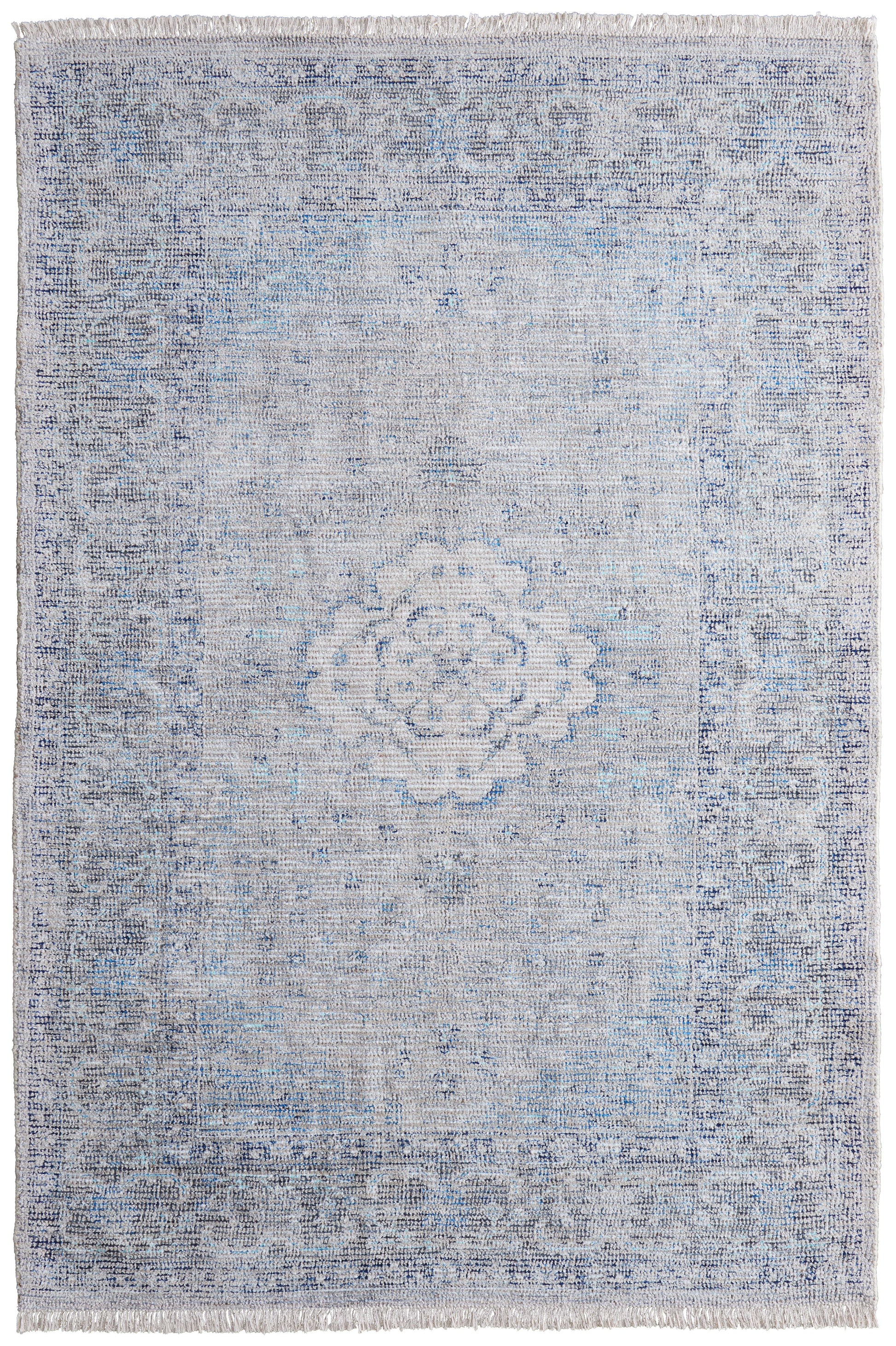 Features a medallion and distressed pattern in gray, blue, and ivory, perfect for adding a vintage touch.