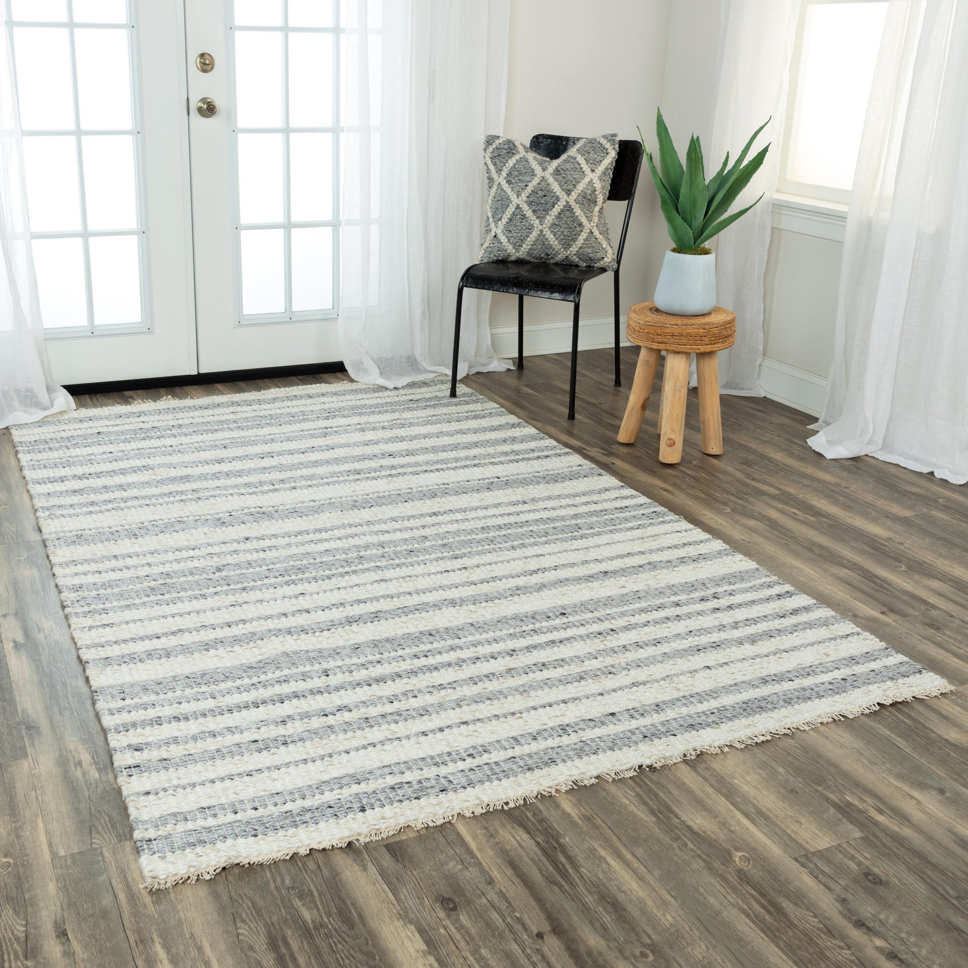 Incorporate the freshness of this Rizzy Home Capri Ivory and Grey Striped Rug for a casual or modern vibe to your living space. This rug has exceptional hand-woven details in 20-percent polyester and 80-percent natural wool that wraps around on both the back and the front. The two ends are hand-finished with a short fringe created from the threads that run the length of the rug to tickle you fancy.