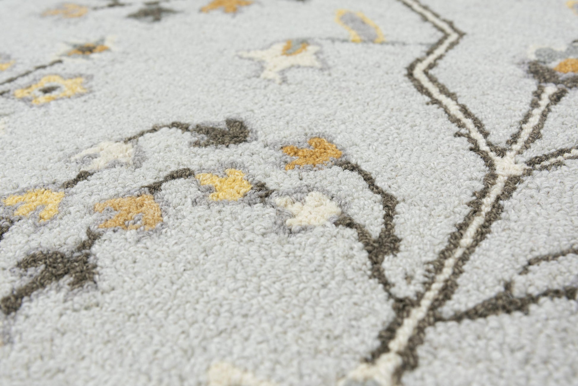 This beautiful area rug from Alora Décor's Conley Collection features a slate gray, ivory, and soft brown color palette, with a traditional Persian Mina-Khani and border design. It is crafted from 100% wool and hand tufted for a luxurious and durable finish. This rug is perfect for adding a touch of elegance and timeless sophistication to any room in your home.