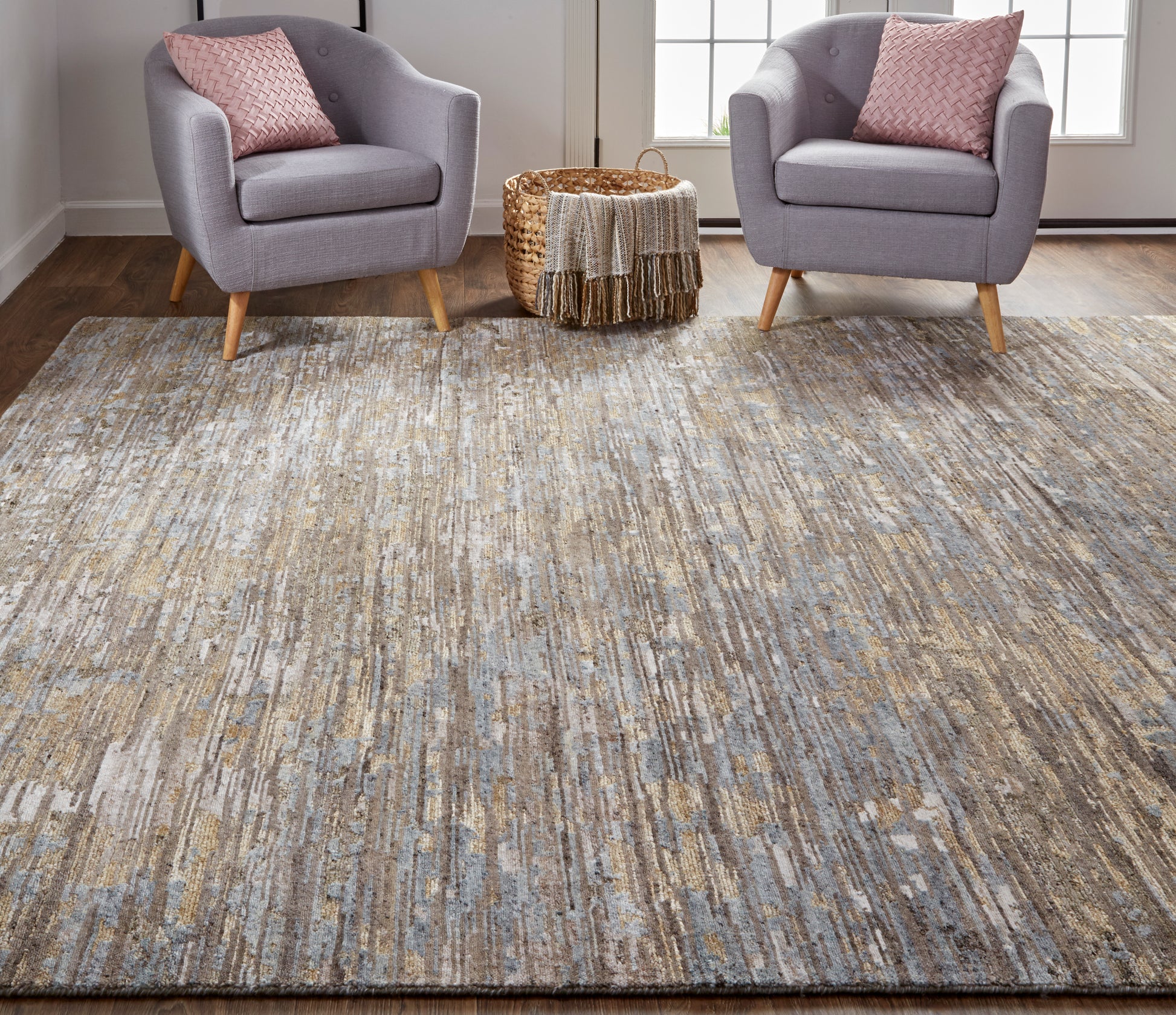 The Feizy Conroe collection is a series of luxurious striations working together to create a work of modern art. Hand-knotted by skilled artisans in India, the collection’s wool and viscose yarns are woven into abstract stripes across the loop and cut pile. Conroe’s distressed features and subtle sheen create an effortless, luxurious look that would complement any transitional or contemporary space in your home or office.