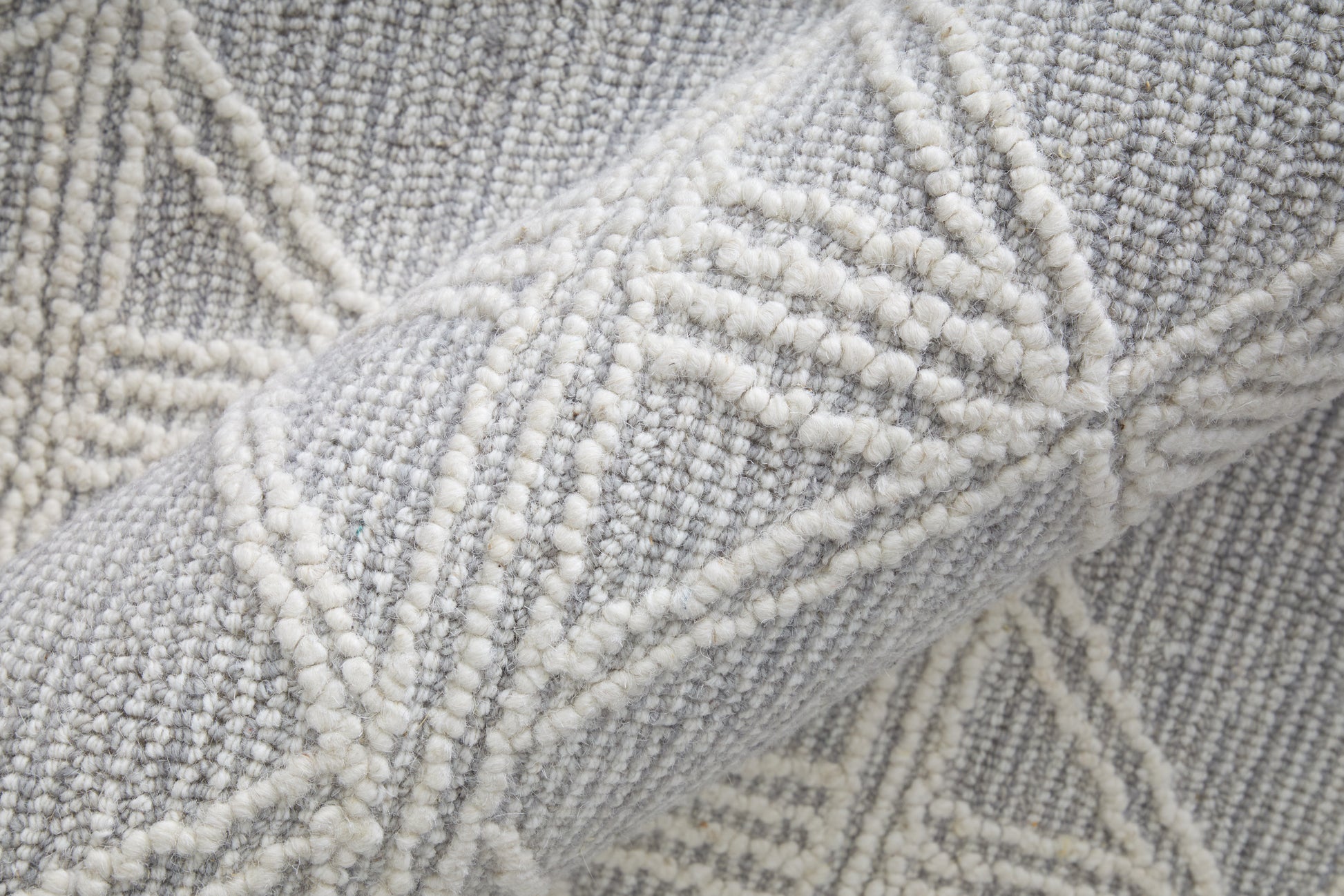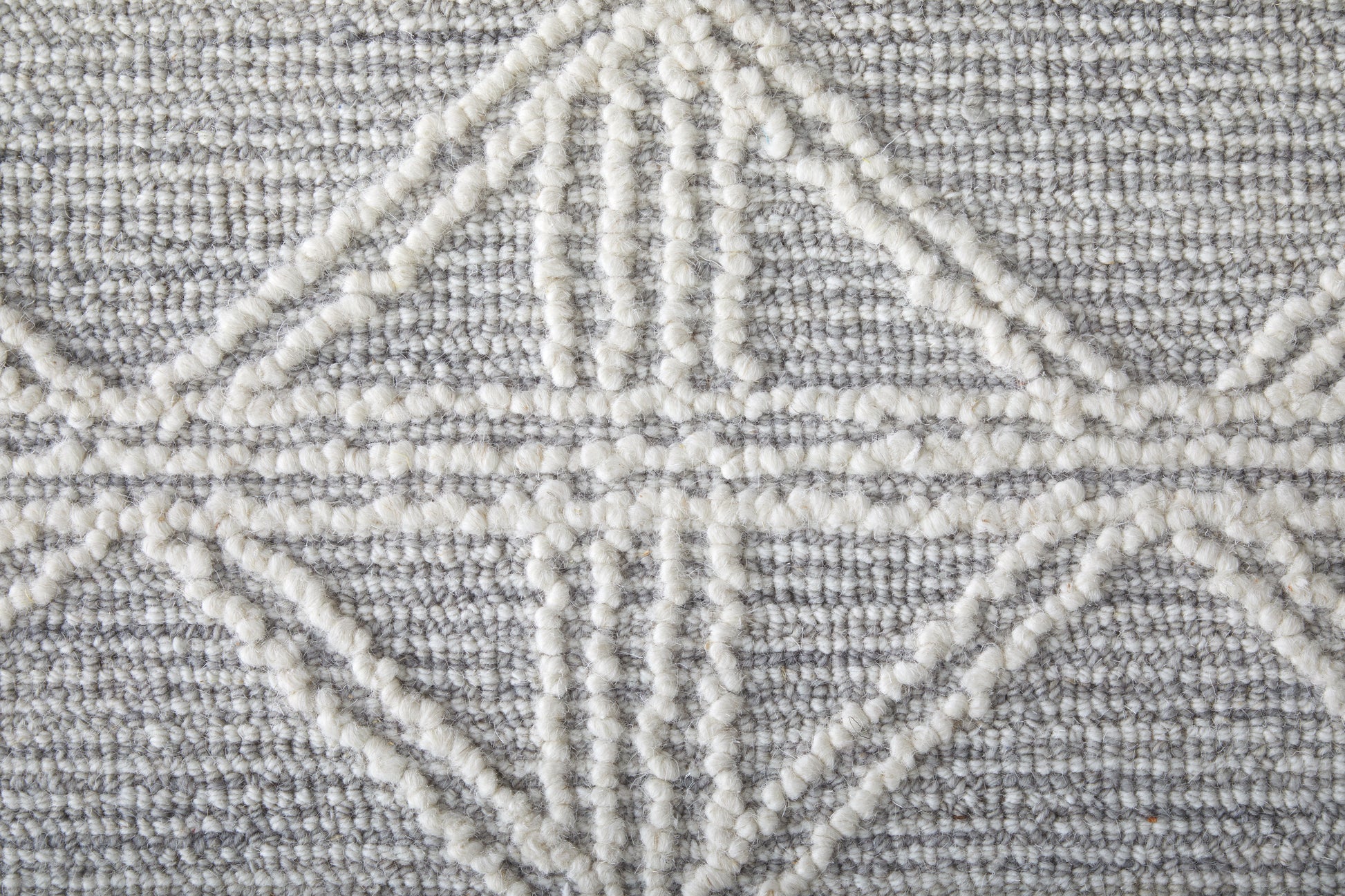 The Corwin Collection by Thom Filicia, made in India, features fine Indian wool and a hand-tufted construction. Space-dyed and finished with tip shearing, the loop pile creates a raised geometric pattern that adds both visual and tactile interest. In silver and ivory, this contemporary rug brings a structured elegance to any space.