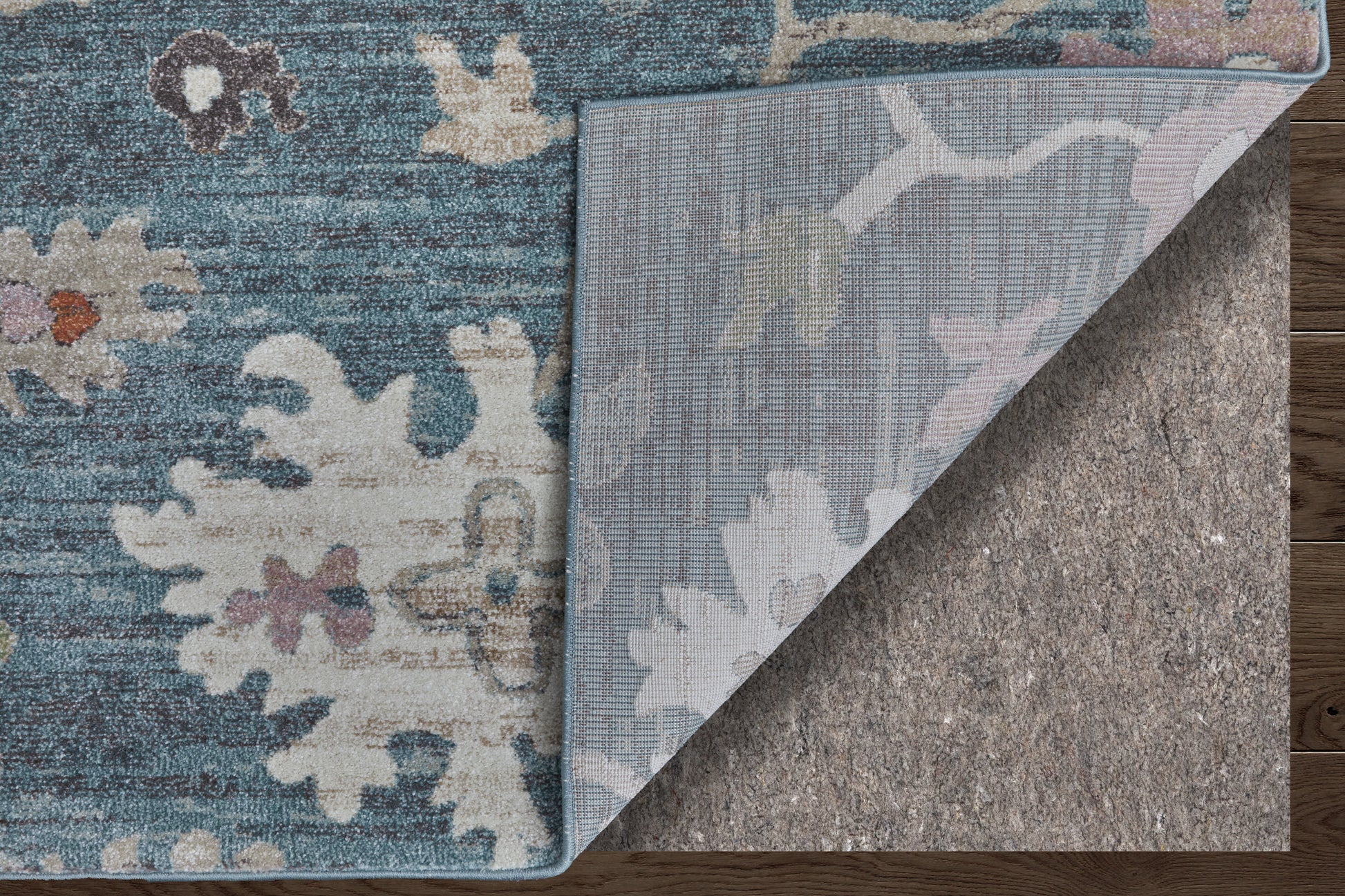Transitional Blue Rug: The floral design in muted greens and creams atop a dusty blue background complements any home decor in living rooms or bedrooms.
