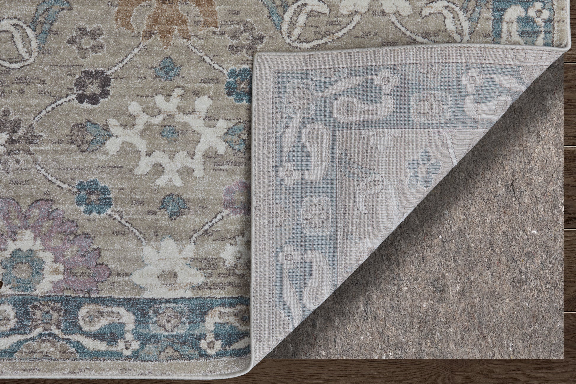 Elegant Design: Gray rug with traditional floral motifs in muted taupe, beige, and dusty blue, perfect for enhancing your living room or reading nook decor.