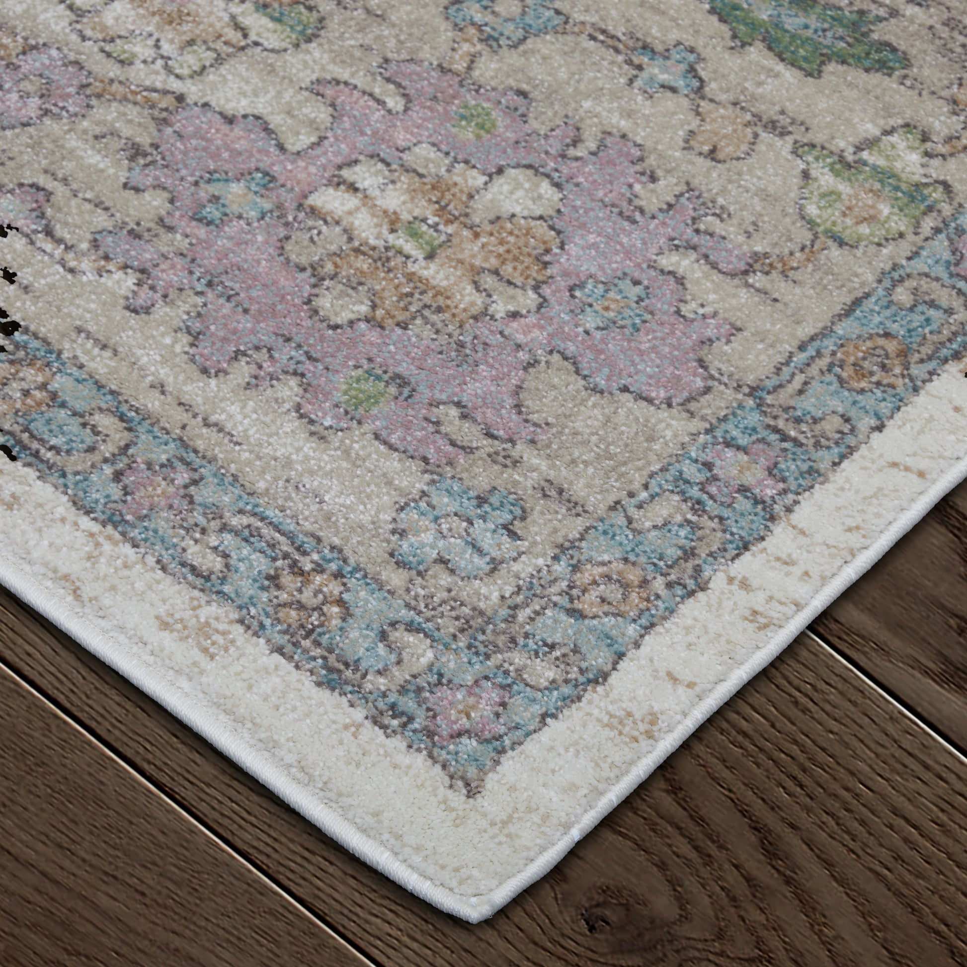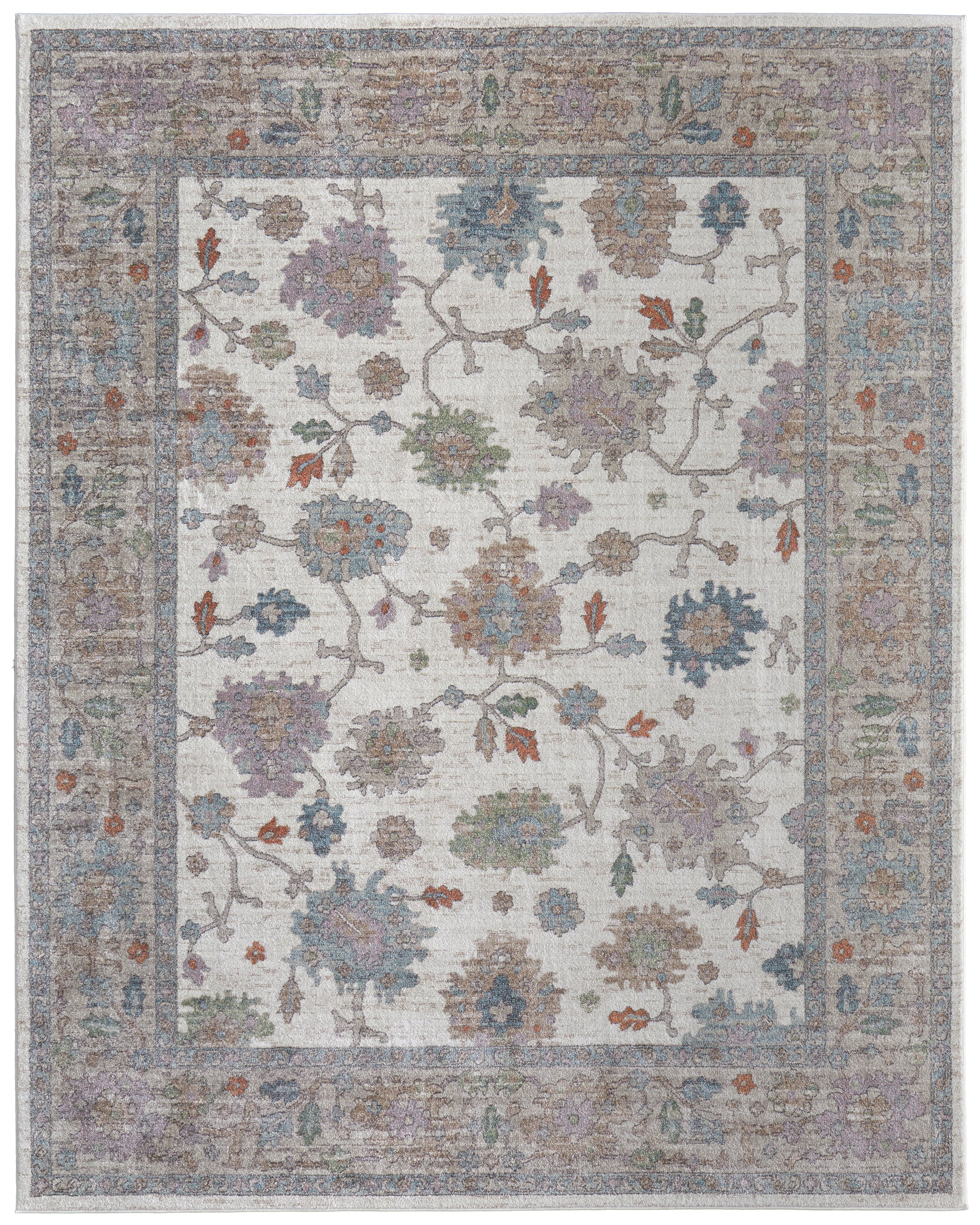 Transitional Ivory Rug: Featuring intricate floral motifs in soft blue, lavender, and rust, it beautifully enhances traditional home decor in any living area.