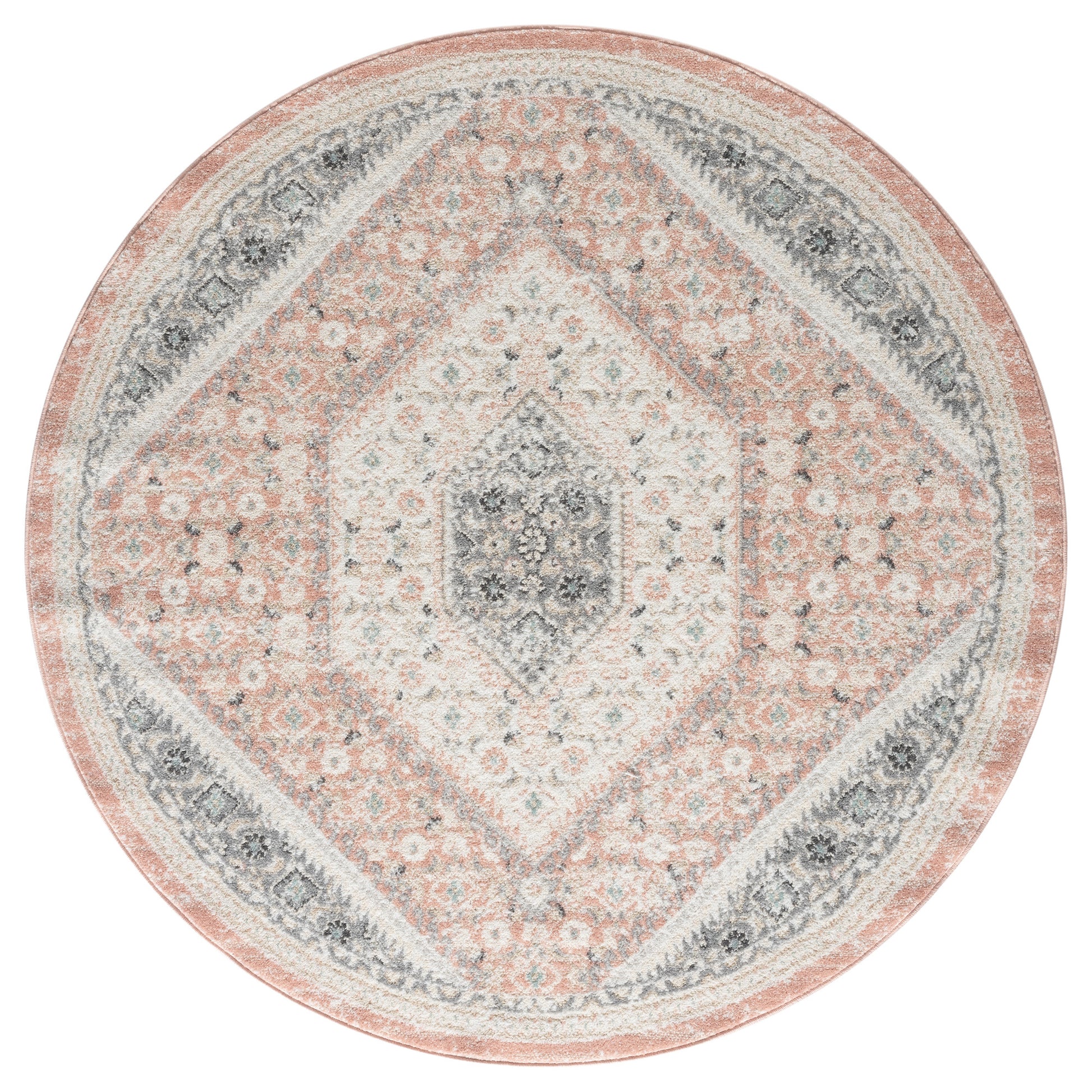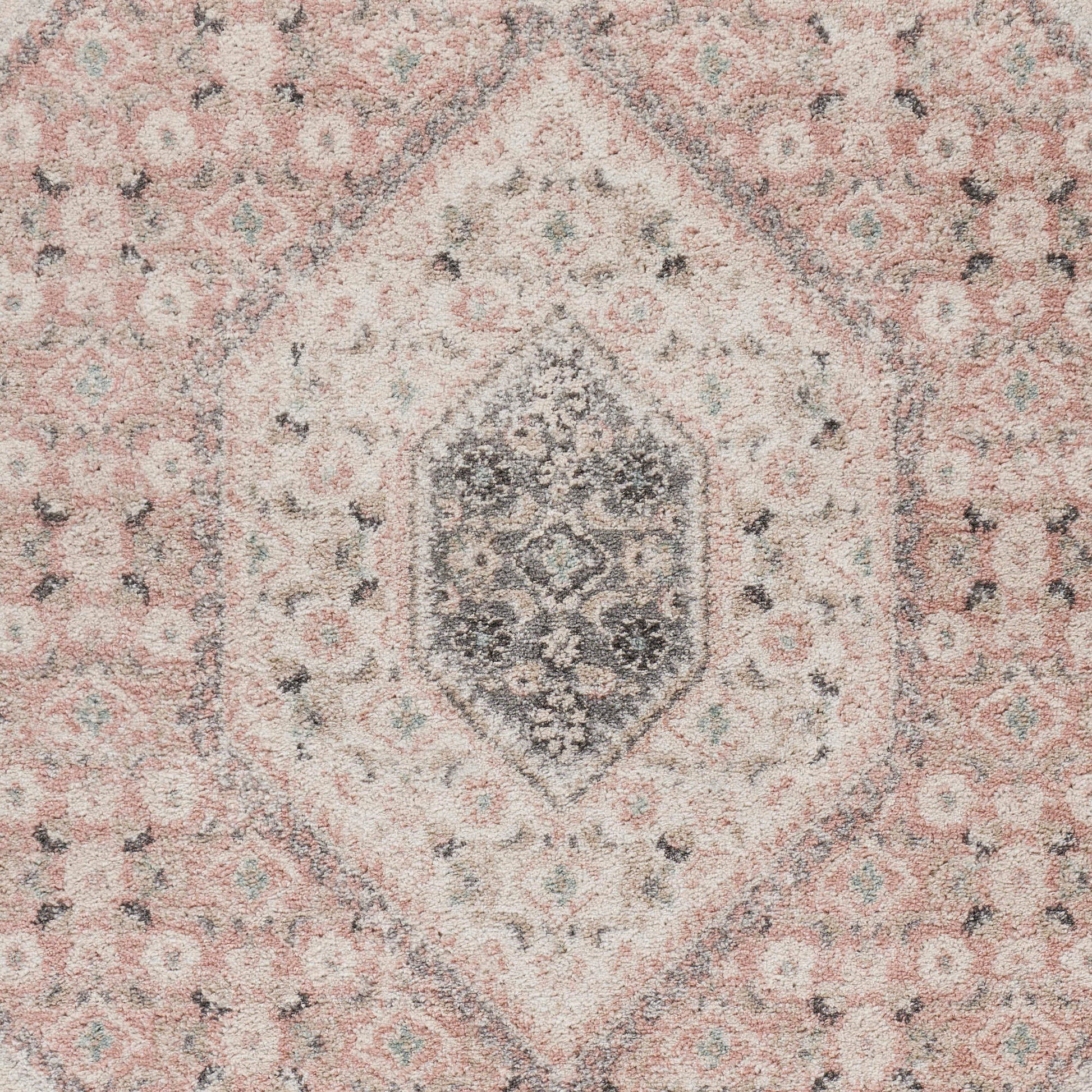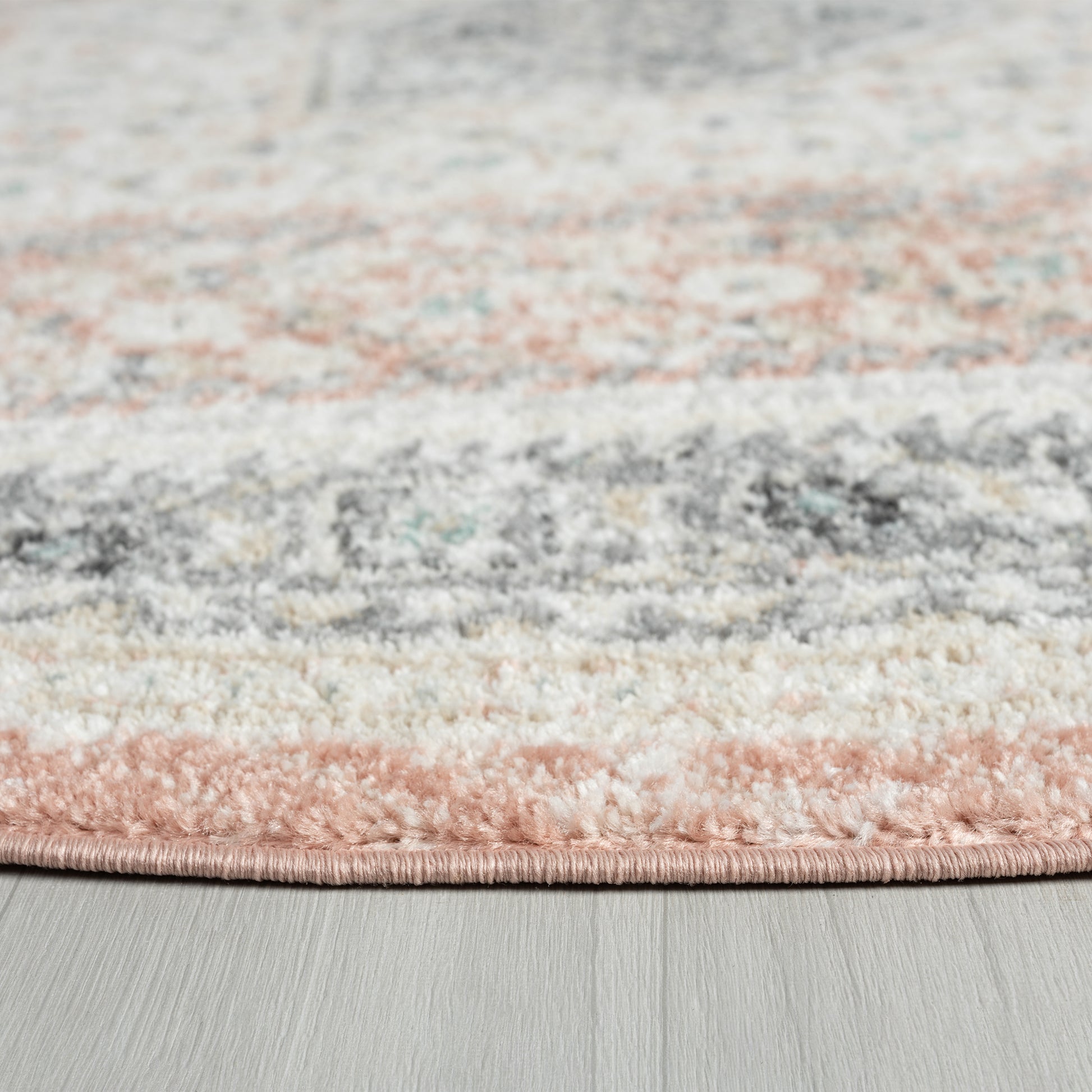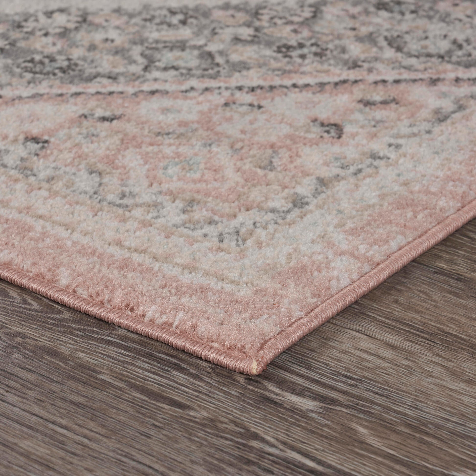Bring refreshing boho-chic botanical style into your home with this traditional oriental area rug. This centerpiece provides delightful color and intricate design that draw the eye without overwhelming your space. The distressed tones of blush pink, gray, beige, and ivory give this area rug a vintage boutique appeal. This power-loomed rug is perfect for busy homes and high traffic areas with its easy-to-clean features and durable construction.