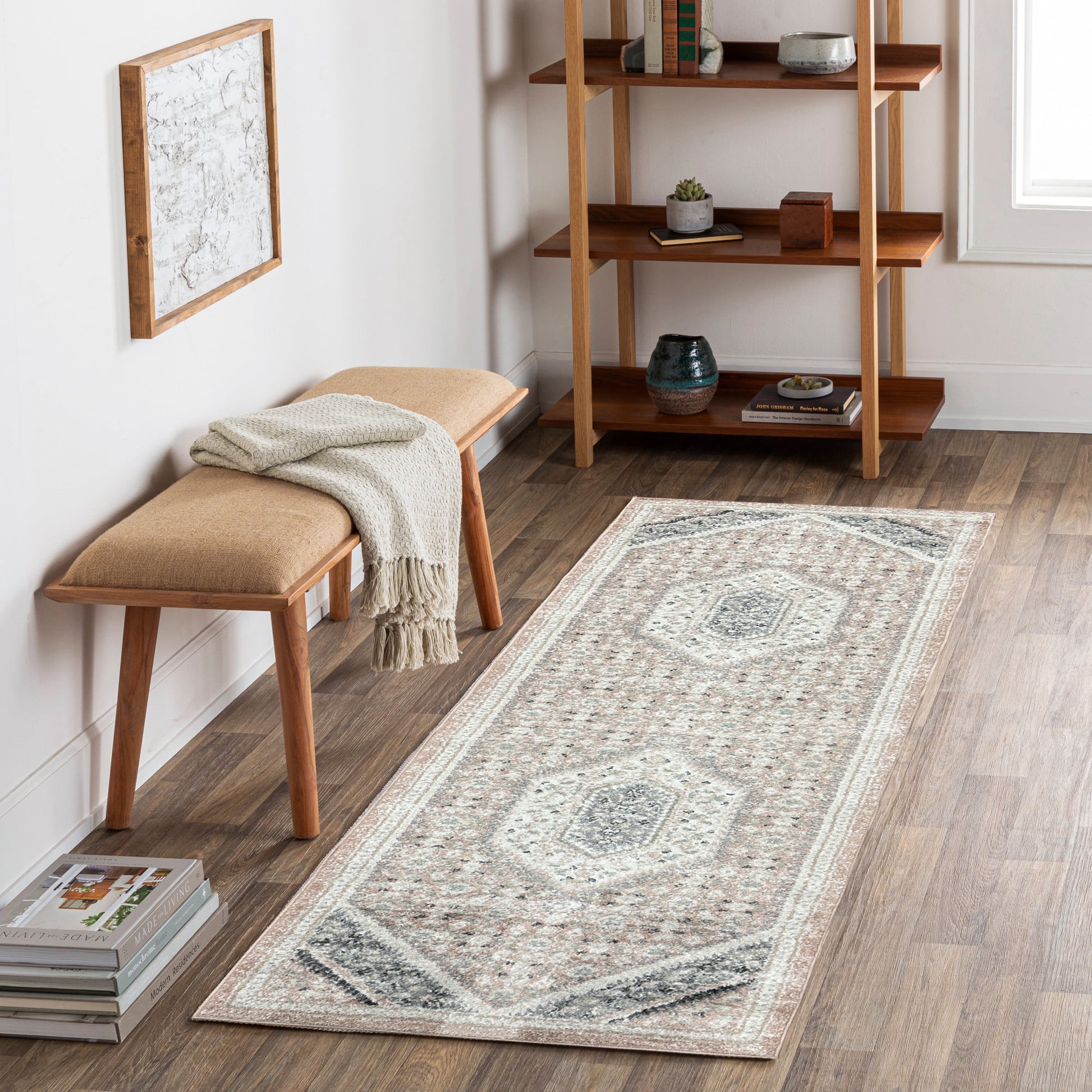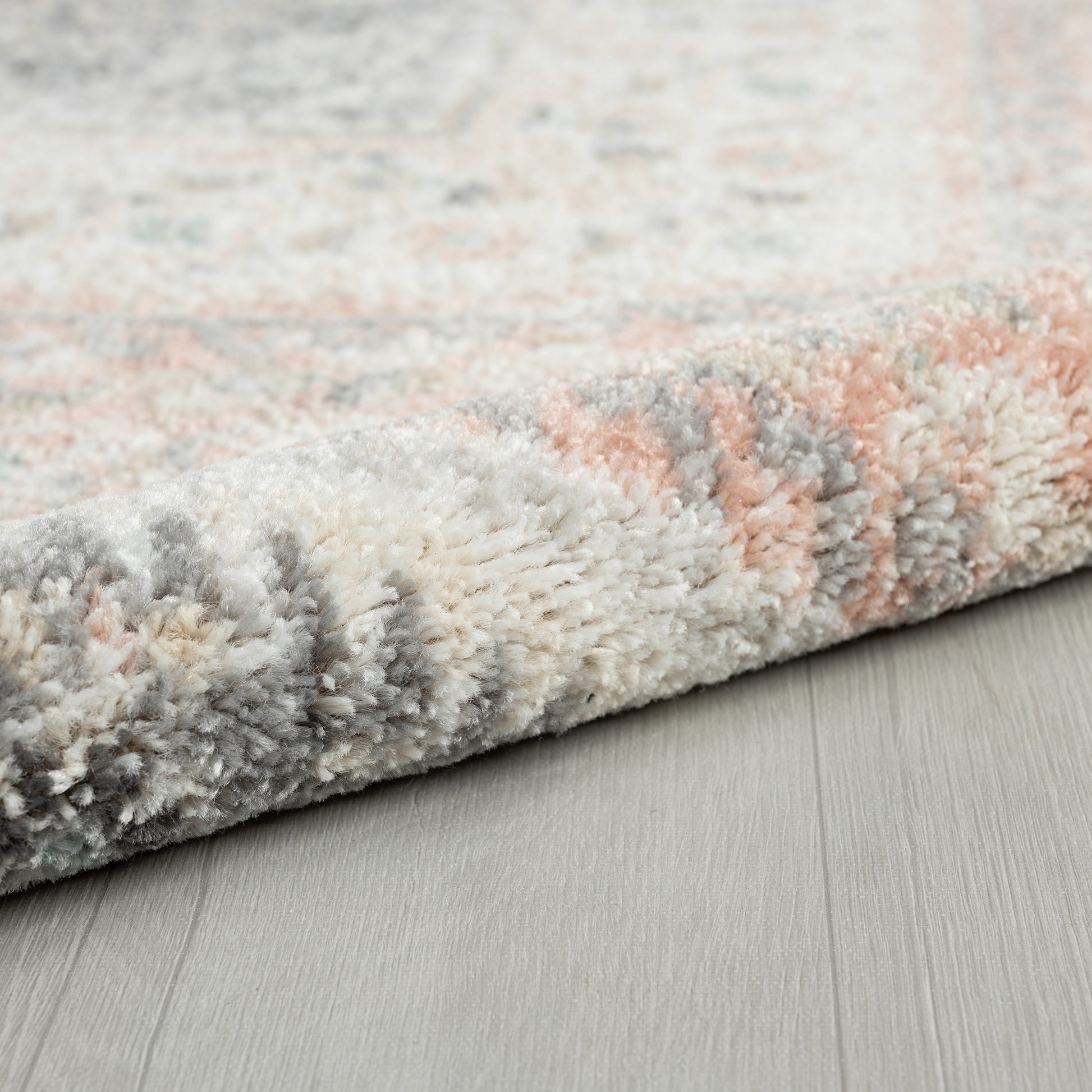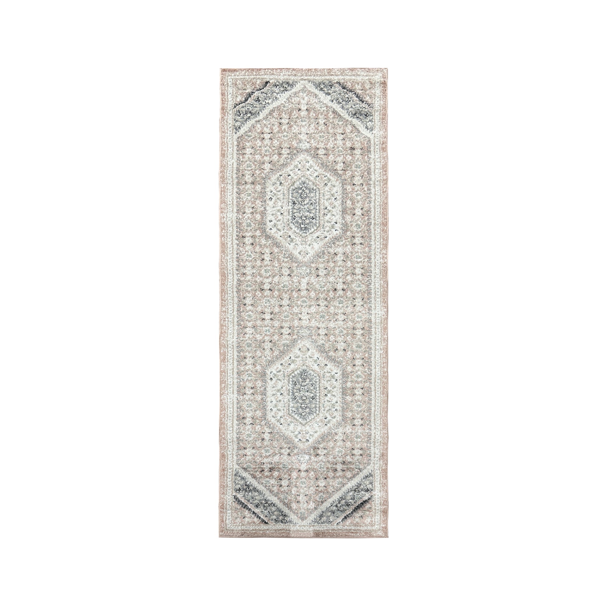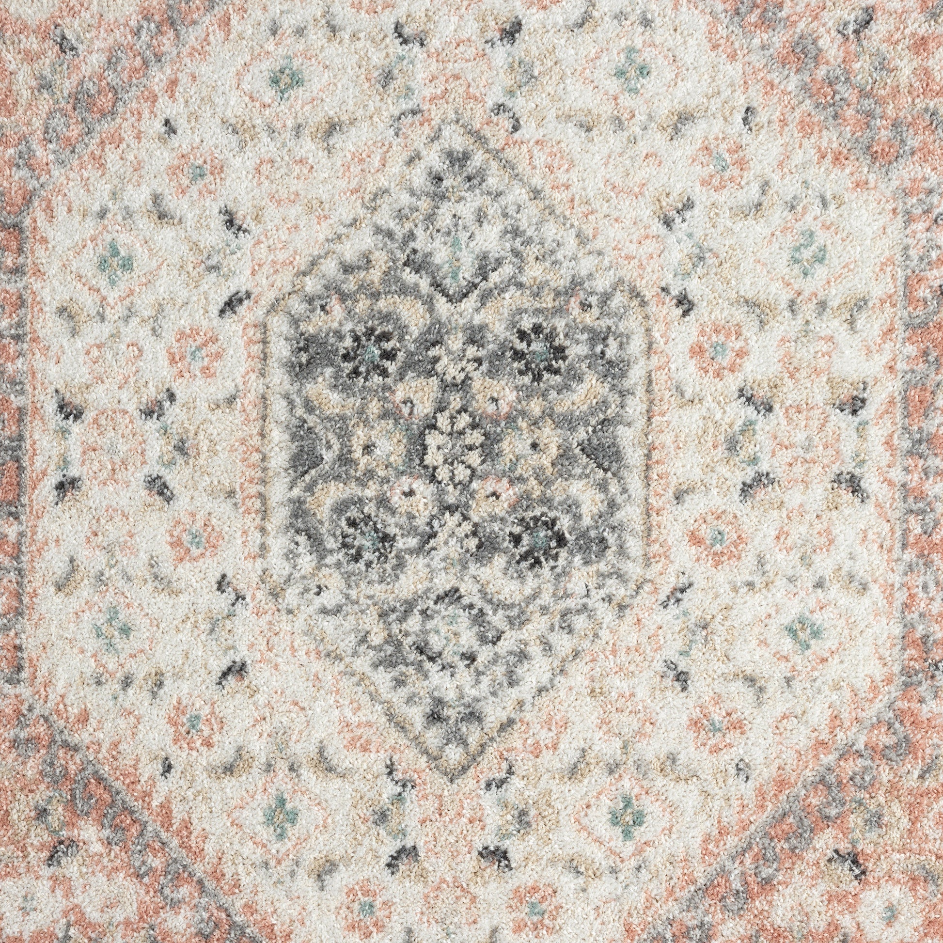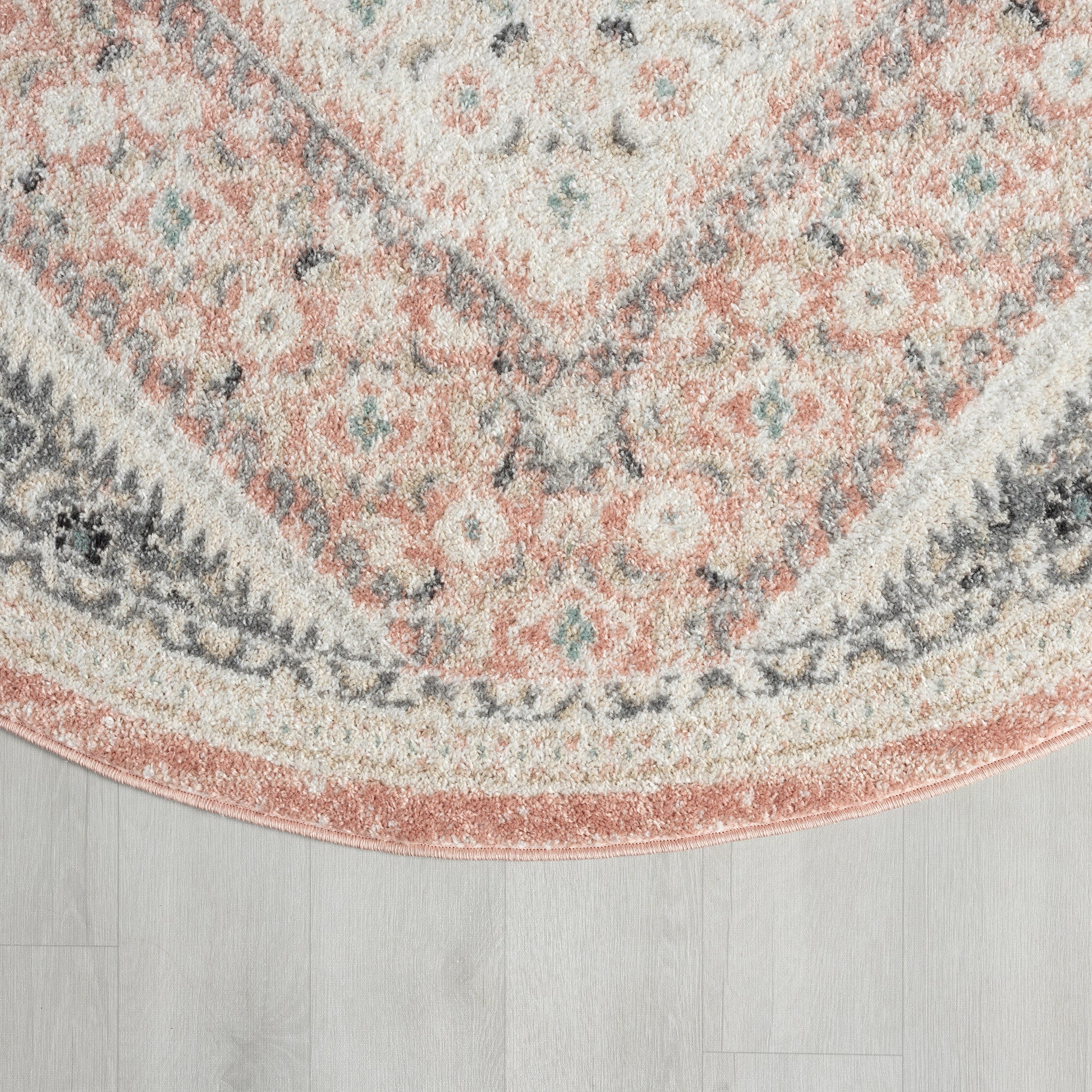 Bring refreshing boho-chic botanical style into your home with this traditional oriental area rug. This centerpiece provides delightful color and intricate design that draw the eye without overwhelming your space. The distressed tones of blush pink, gray, beige, and ivory give this area rug a vintage boutique appeal. This power-loomed rug is perfect for busy homes and high traffic areas with its easy-to-clean features and durable construction.