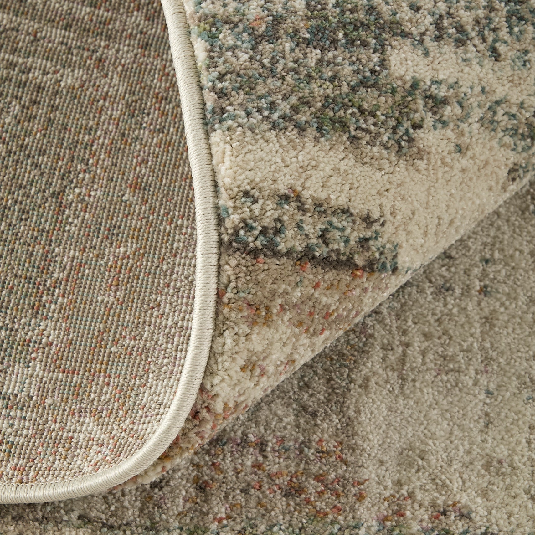 Ivory Rug: The modern, industrial style with a subtle distressed pattern in beige, blush, and gray complements cozy living rooms or serene bedrooms.
