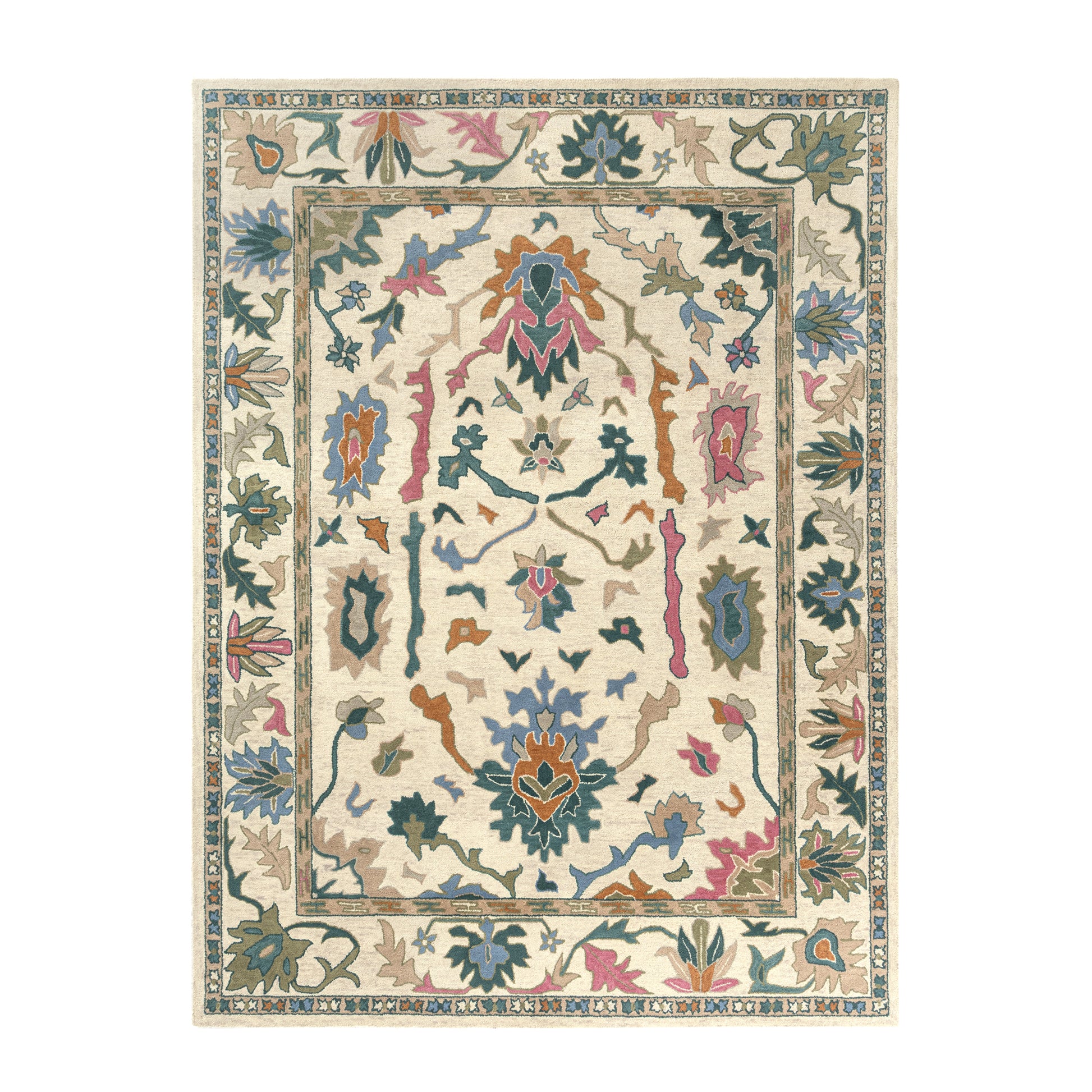 Features a vintage Persian-inspired floral and Oushak design in cream and multicolor tones