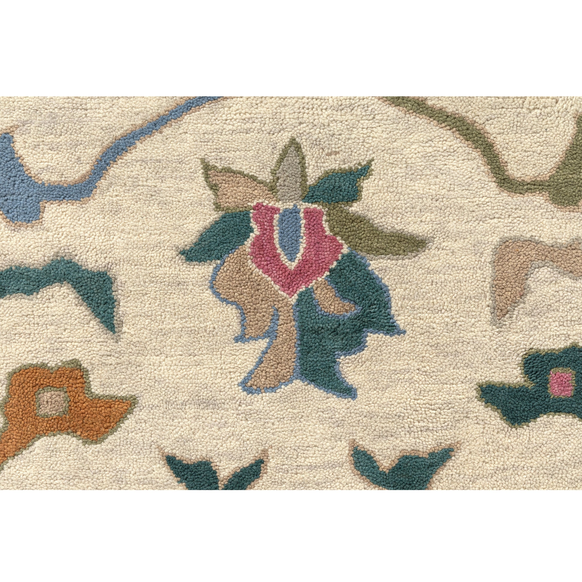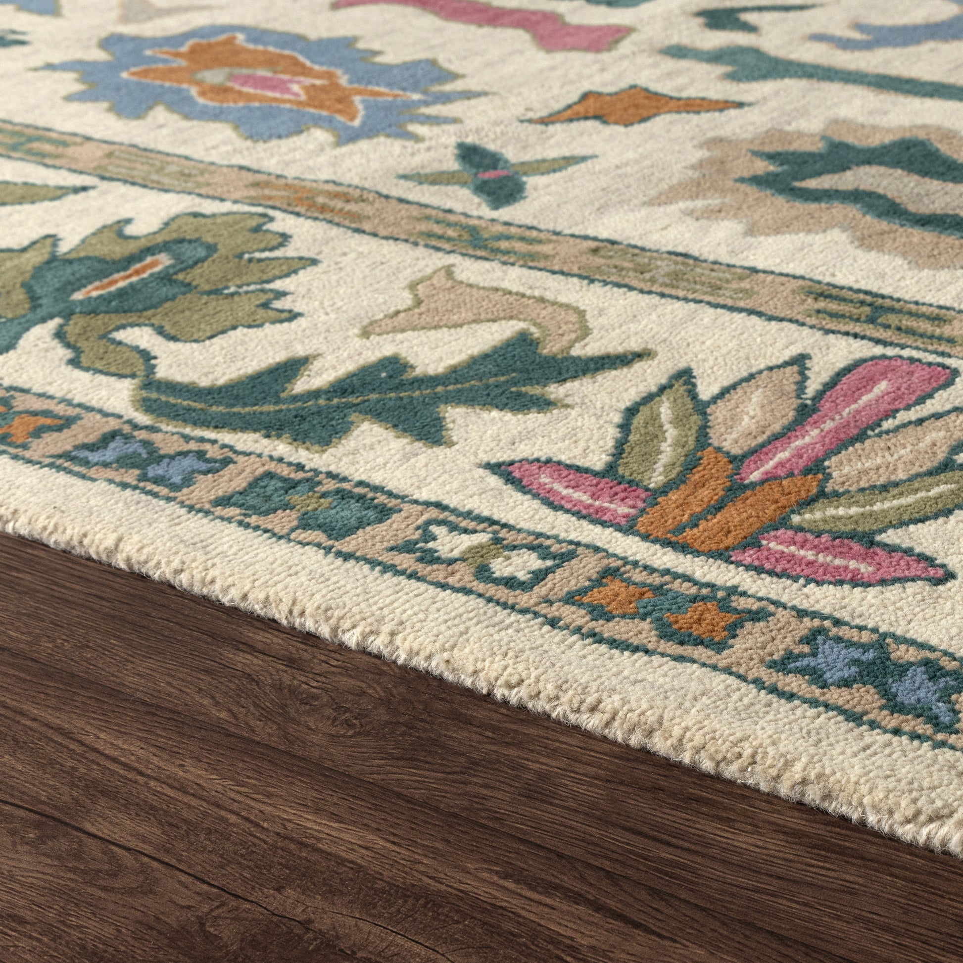 Add timeless character and artistic depth to your home, apartment, or dorm with this hand-tufted indoor area rug in rich cream and multicolor tones. Showcasing a vintage-inspired bordered floral Oushak design, this rug brings a curated, lived-in look that beautifully complements traditional, transitional, and bohemian interiors. Expertly hand-tufted in India from a durable New Zealand and Argentinian wool blend, it offers a soft, cushioned feel underfoot while standing up well in everyday living - ideal for high-traffic areas. The 5'9" x 8'9" size is ideal for living rooms, dining areas, or bedrooms, providing a balanced foundation that ties the space together. Ideal for those who appreciate artisanal craftsmanship and bold, colorful design.
