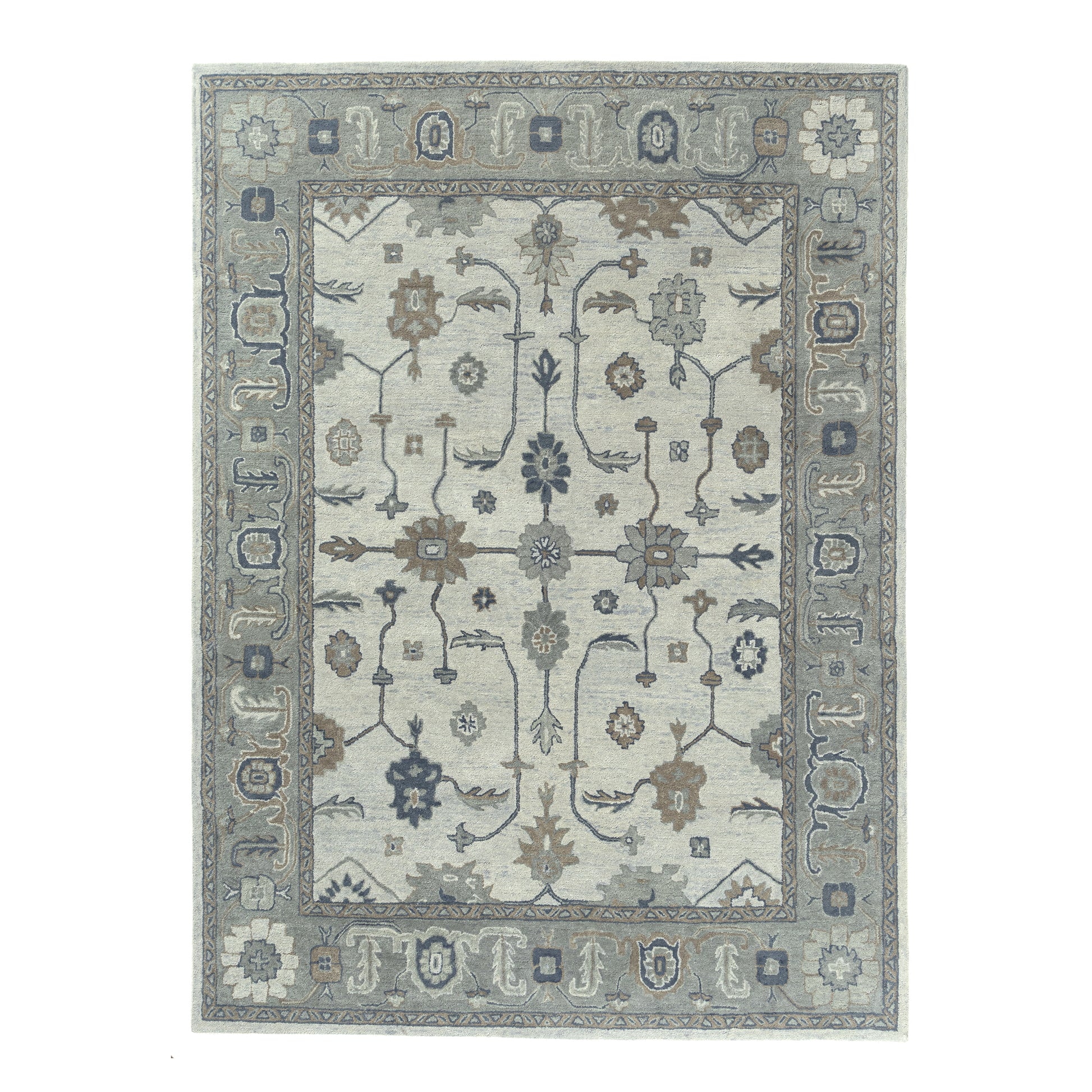 Add timeless character and artistic depth to your home, apartment, or dorm with this hand-tufted indoor area rug in rich blue and gray tones. Showcasing a vintage-inspired Persian bordered floral Oushak design, this rug brings a curated, lived-in look that beautifully complements traditional, transitional, and bohemian interiors. Expertly hand-tufted in India from a durable New Zealand and Argentinian wool blend, it offers a soft, cushioned feel underfoot while standing up well in everyday living - ideal for high-traffic areas. The 5'9" x 8'9" size is ideal for living rooms, dining areas, or bedrooms, providing a balanced foundation that ties the space together. Ideal for those who appreciate artisanal craftsmanship and bold, colorful design.