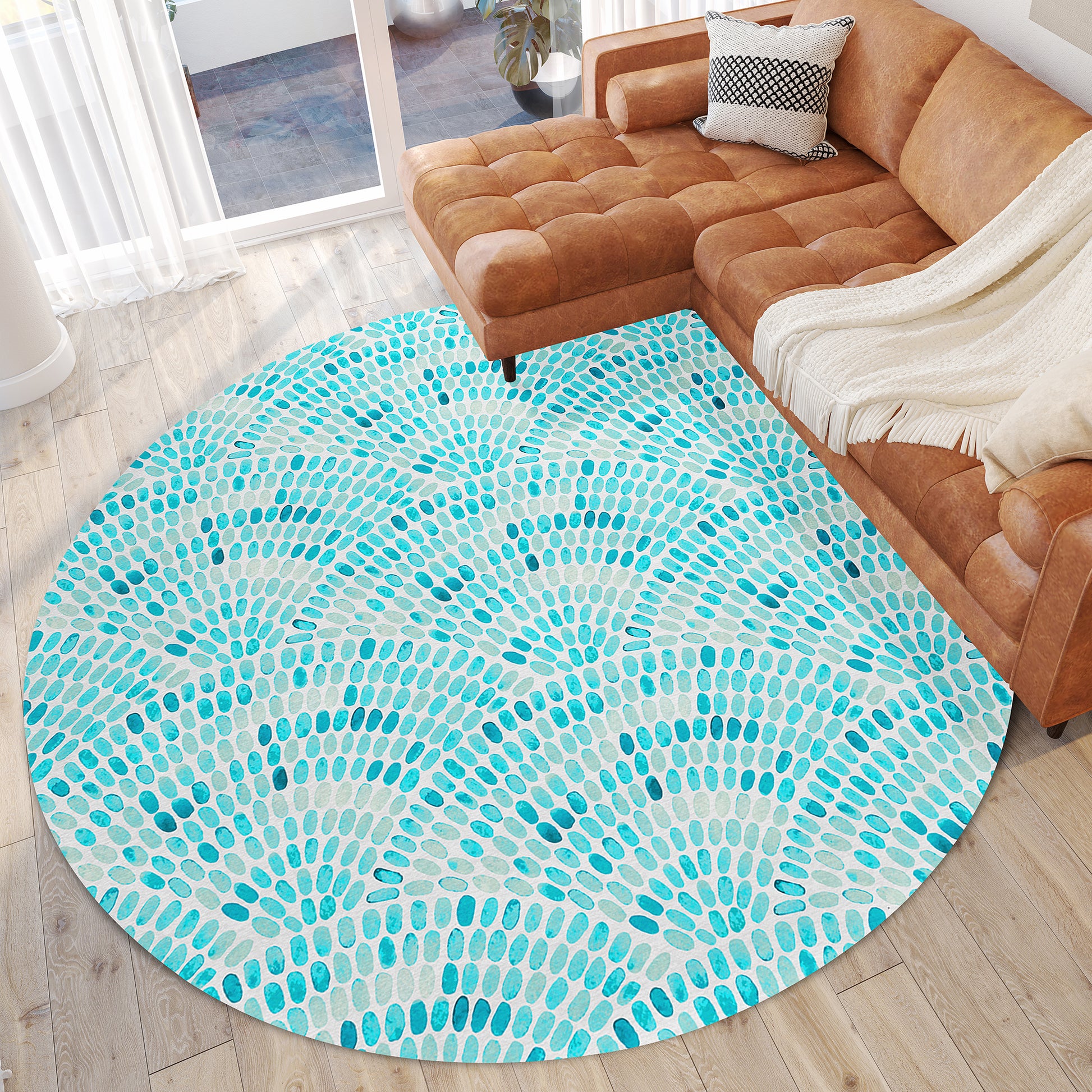 Remarkable Seabreeze collection has been created to inspire tranquility. Wow your guests with these versatile casual coastal rugs, stylish flat weave rug features vibrant colors with gradient movement in a variety of natural beach mosaic shapes and patterns. Featuring an ultra-soft and ultra thin pile, each rug is made with 100% polyester pile complete with a non-skid backing. Final crafting in USA using domestic processing on an imported substrate. They are UV Stabilized for indoor and cover outdoor spaces. Shake out or use straight suction with vacuum, do not use a beater bar. Machine washable in cold water and air dry, some sizes may be too large for a residential washing machine and is family and pet friendly.