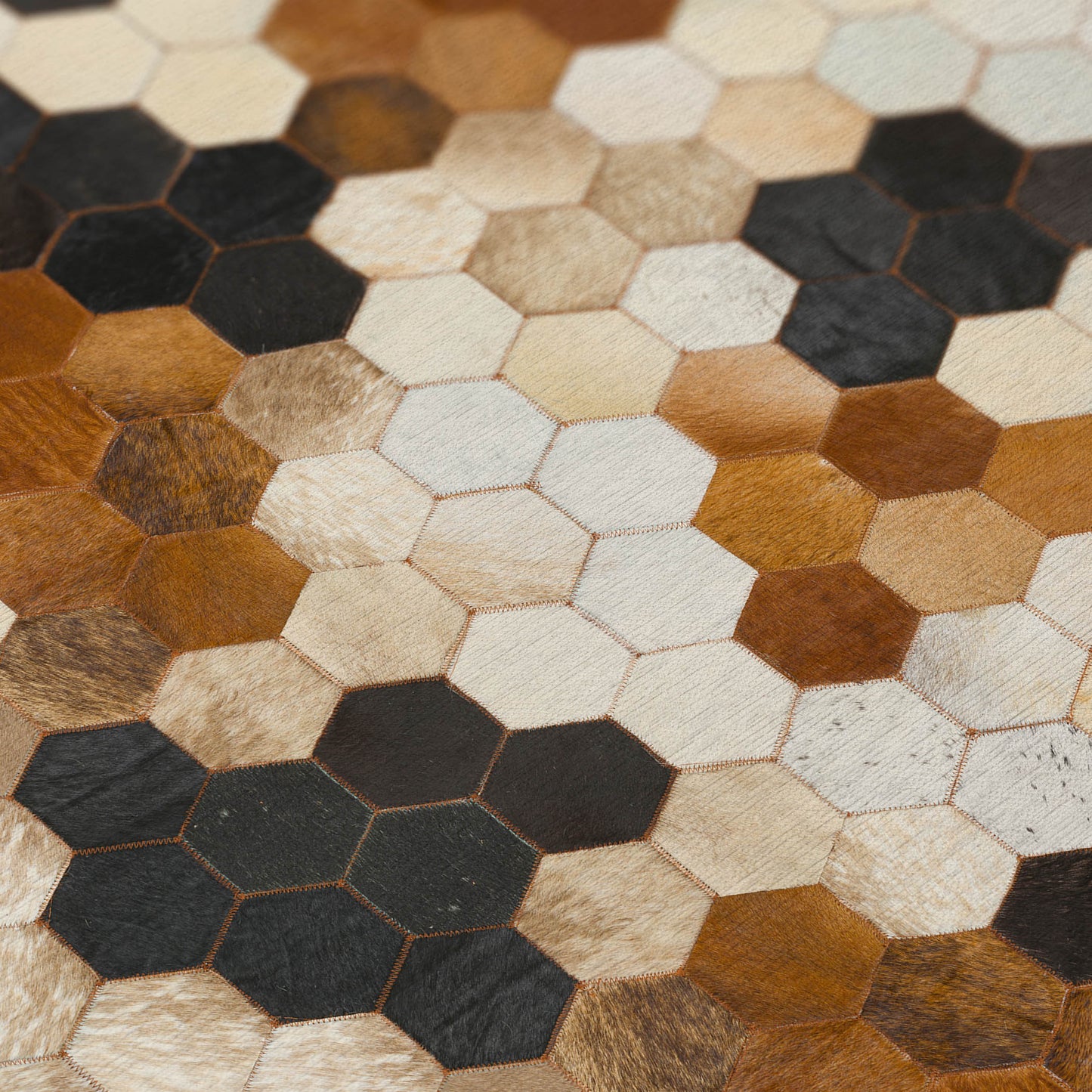 Stetson is a faux hide patchwork collection. The details on these faux hide rugs look so real you will wow your guests. This stylish rug features neutral colors with gradient movement in a variety of mosaic shapes and patterns. Featuring an ultra-soft and ultra thin pile, each rug is made with 100% polyester pile complete with a non-skid backing. Final crafting in USA using domestic processing on an imported substrate. They are UV Stabilized for indoor and cover outdoor spaces. Shake out or use straight suction with vacuum, do not use a beater bar. Machine washable in cold water and air dry, some sizes may be too large for a residential washing machine and is family and pet friendly.