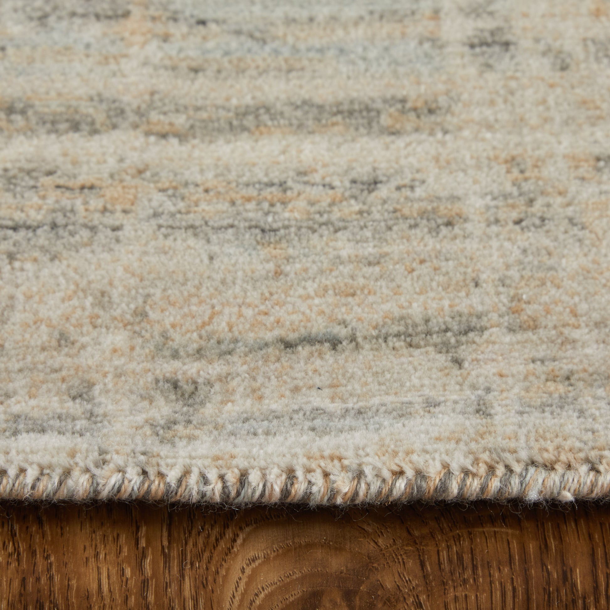 The Jaxson Collection, crafted in India, features New Zealand wool and a machine-made construction. Despite its machine-made origins, hand-carved details and a high/low cut pile create a visually appealing three-dimensional design. Worsted spinning adds a luxurious feel and enhances durability, while hand washing gives the rug a refined finish. The contemporary style, inspired by fine art and natural surfaces, showcases irregular layered patterns in gray, ivory, blue, beige, and red.
