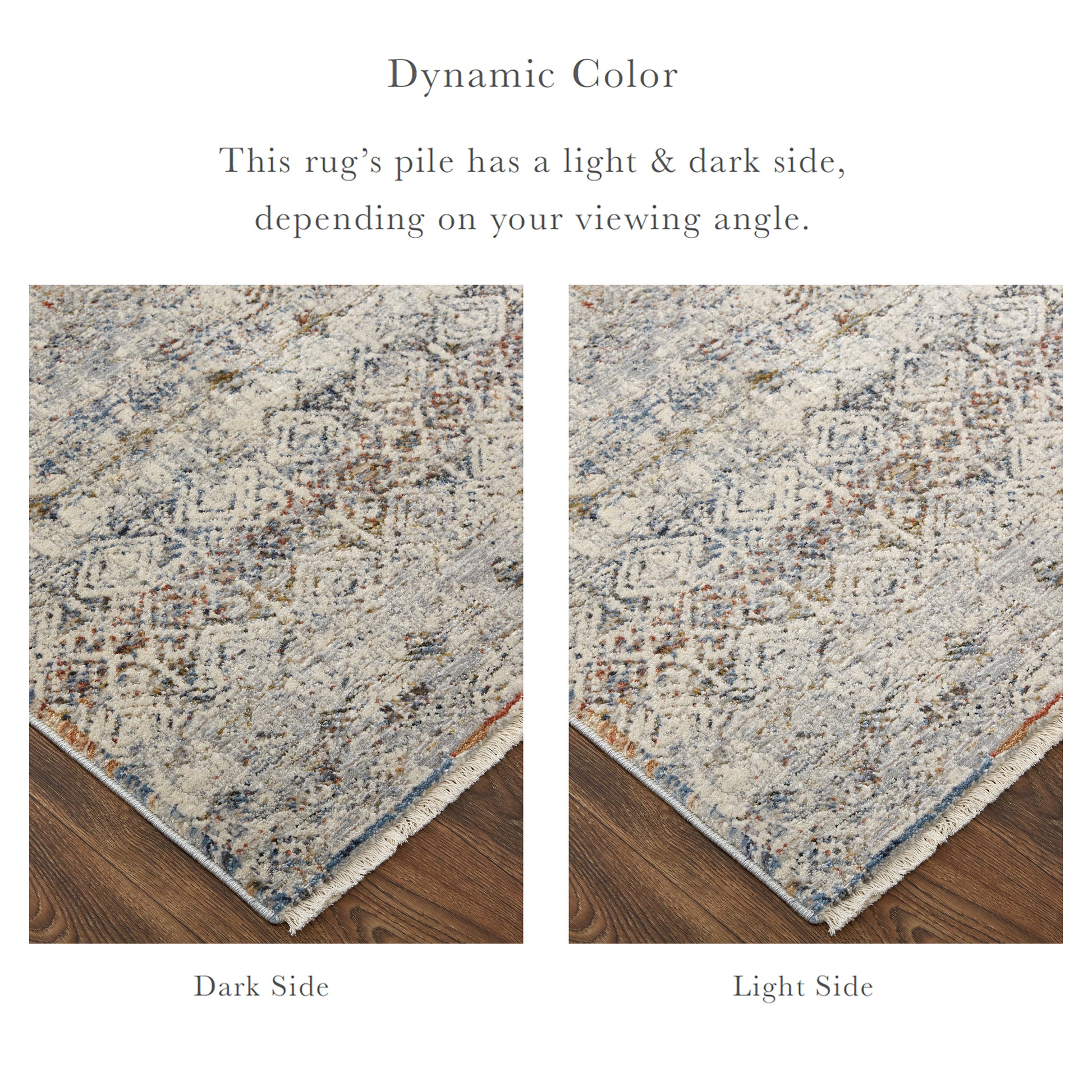 The Feizy Kaia collection is woven in Turkey with polypropylene, viscose, and polyester. Because of the viscose in this area rug, the rug feels soft to the touch and gives a look and feel that is both luxe and durable. Since the blend of materials makes this rug fade-resistant, the area rug can be placed where there is high traffic in the home. The distressed, traditional and transitional inspired pattern of the rug comes in neutral colors of light blue, warm gray, and ivory.