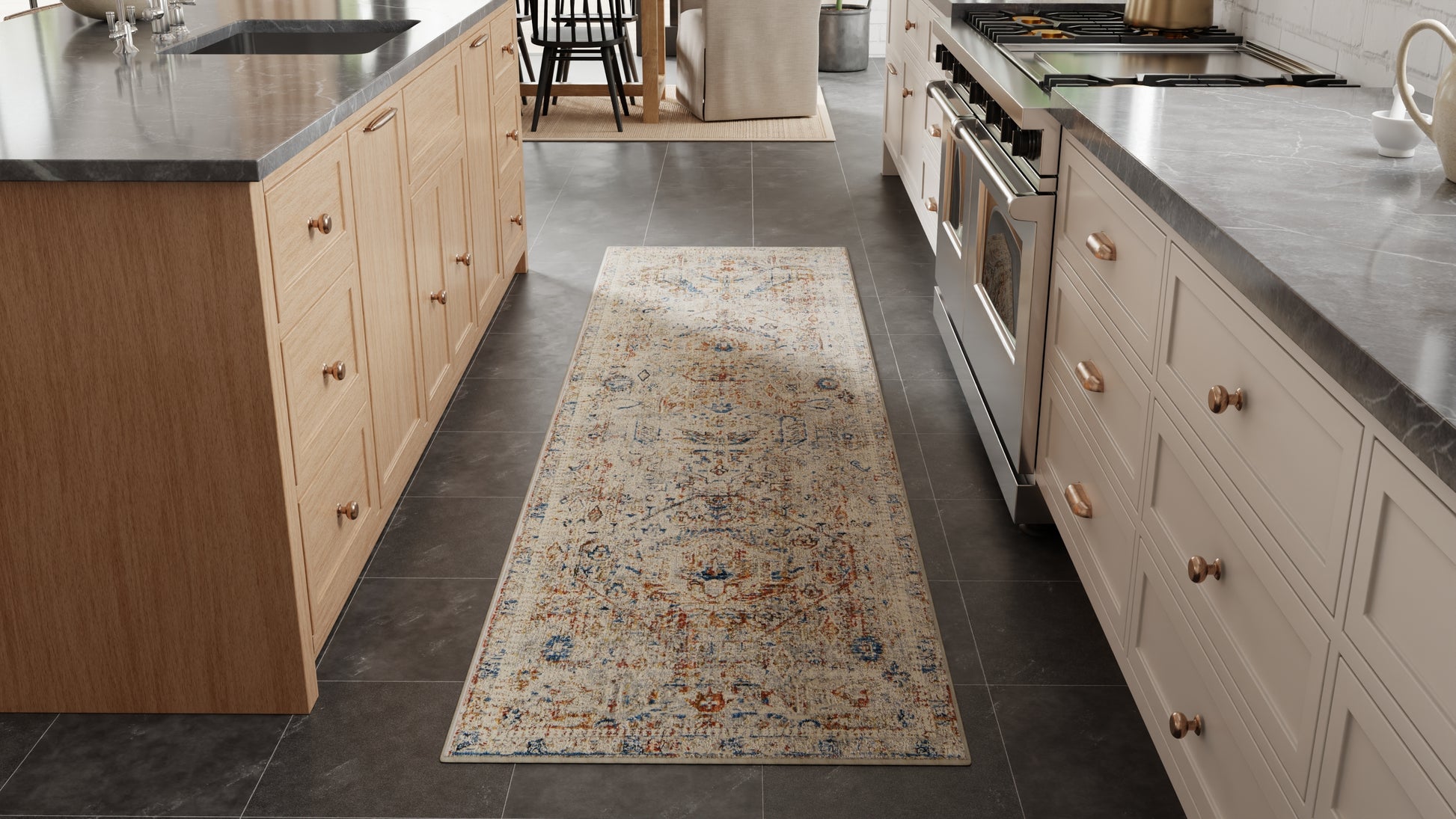 The Feizy Kaia collection is woven in Turkey with polypropylene, viscose, and polyester. Because of the viscose in this area rug, the rug feels soft to the touch and gives a look and feel that is both luxe and durable. Since the blend of materials makes this rug fade-resistant, the area rug can be placed where there is high traffic in the home. The distressed, traditional and transitional inspired pattern of the rug comes in neutral colors of light blue, warm gray, and ivory.