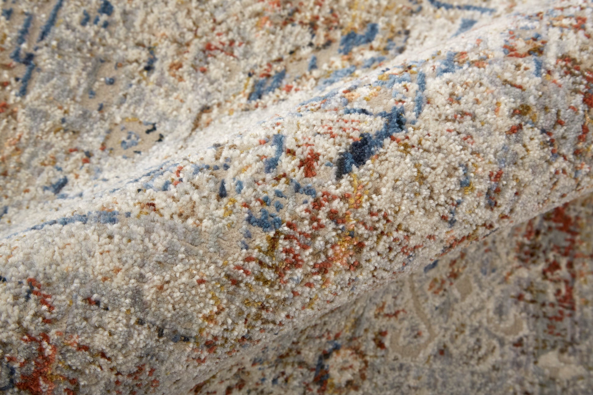 The Feizy Kaia collection is woven in Turkey with polypropylene, viscose, and polyester. Because of the viscose in this area rug, the rug feels soft to the touch and gives a look and feel that is both luxe and durable. Since the blend of materials makes this rug fade-resistant, the area rug can be placed where there is high traffic in the home. The distressed, traditional and transitional inspired pattern of the rug comes in neutral colors of light blue, warm gray, and ivory.