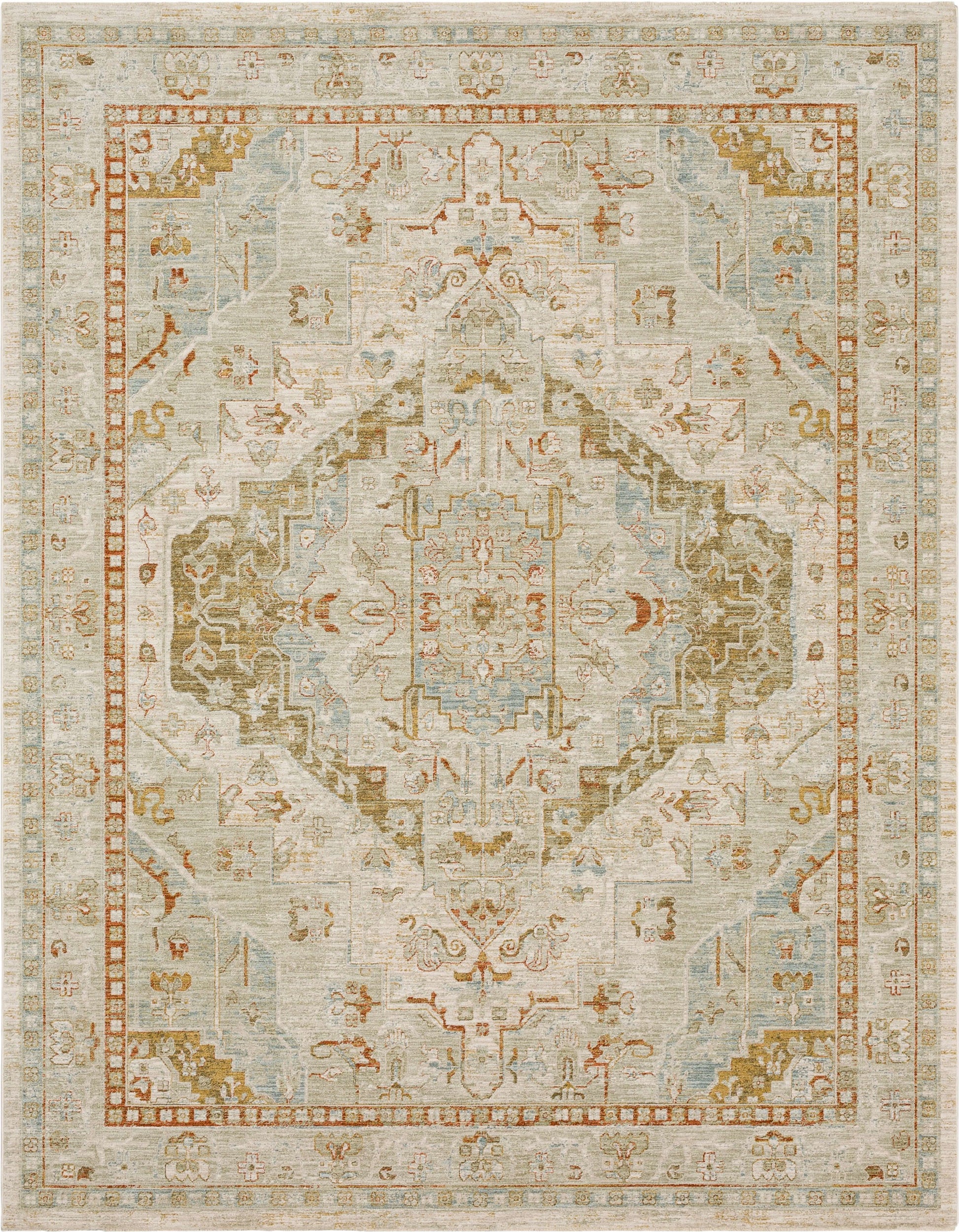 An elegant antique inspired interpretation of traditional Heriz styles, Karastan’s Kumra Area Rug in Cream steals the show. Ideal for elegant entryways, luxurious living rooms, beautiful bedrooms, opulent offices and more, the designs of the Adalia Collection are thoughtfully woven with a soft and stain-resistant blend of synthetic yarns. Imported from Turkey, each debut of this collection exudes international flair with a vintage fringed trim along the edges. Available in a spectrum of sizes, this area rug is beautiful as a set or solo.