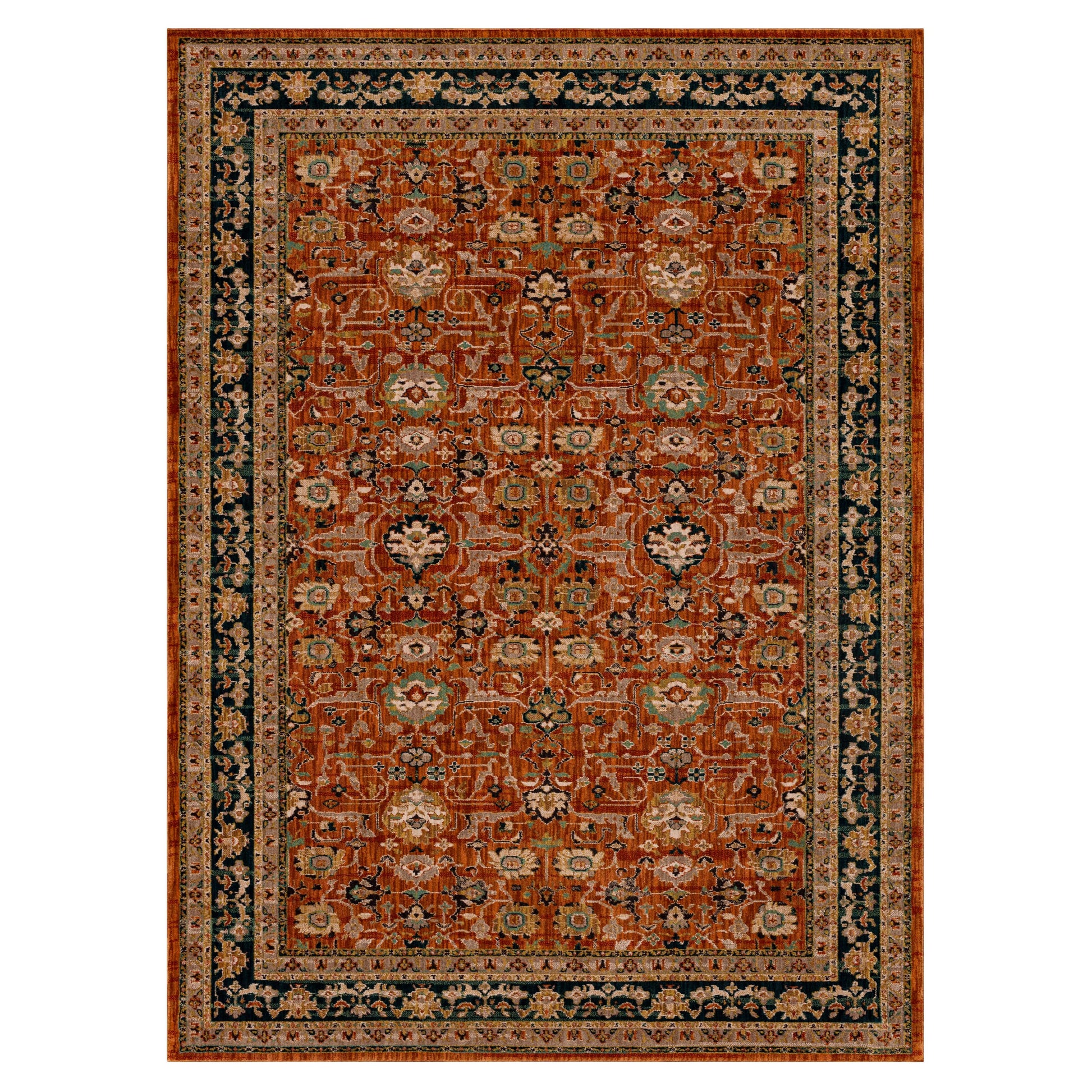 With all the stately prestige and timeless tradition of an heirloom quality Persian rug, the Keralam area rug features lavish layers of ornate outlines and original artistry. Showcased in a Mediterranean inspired palette of warm spice, spiked with accents of tobacco, gold, sapphire, cream, charcoal, citron, garnet and aquamarine. Machine woven from premium polyester fibers, the Karastan Spice Market collection offers rugs with thick, sumptuous softness, inherent stain resistance, and striking color clarity.
