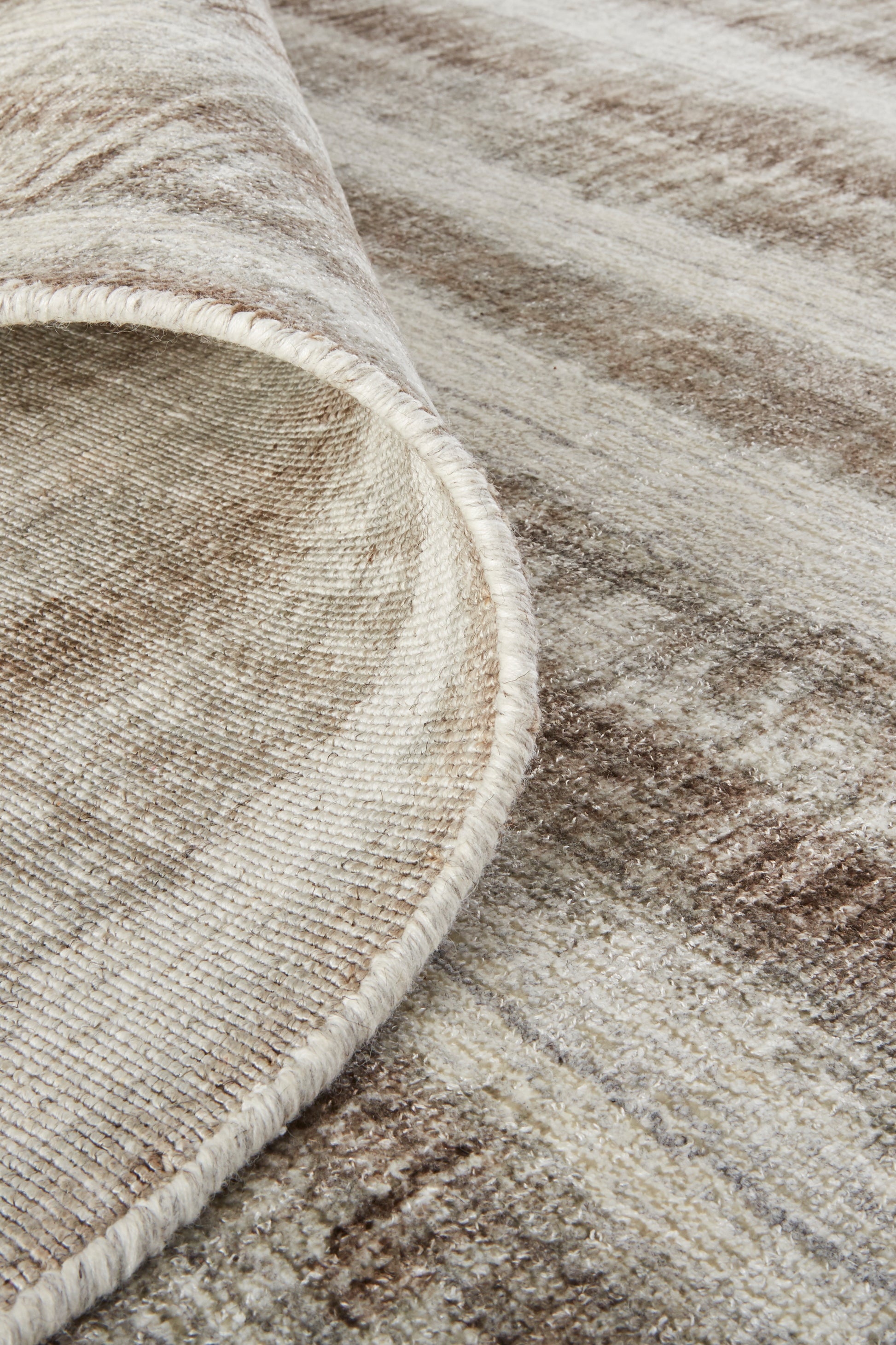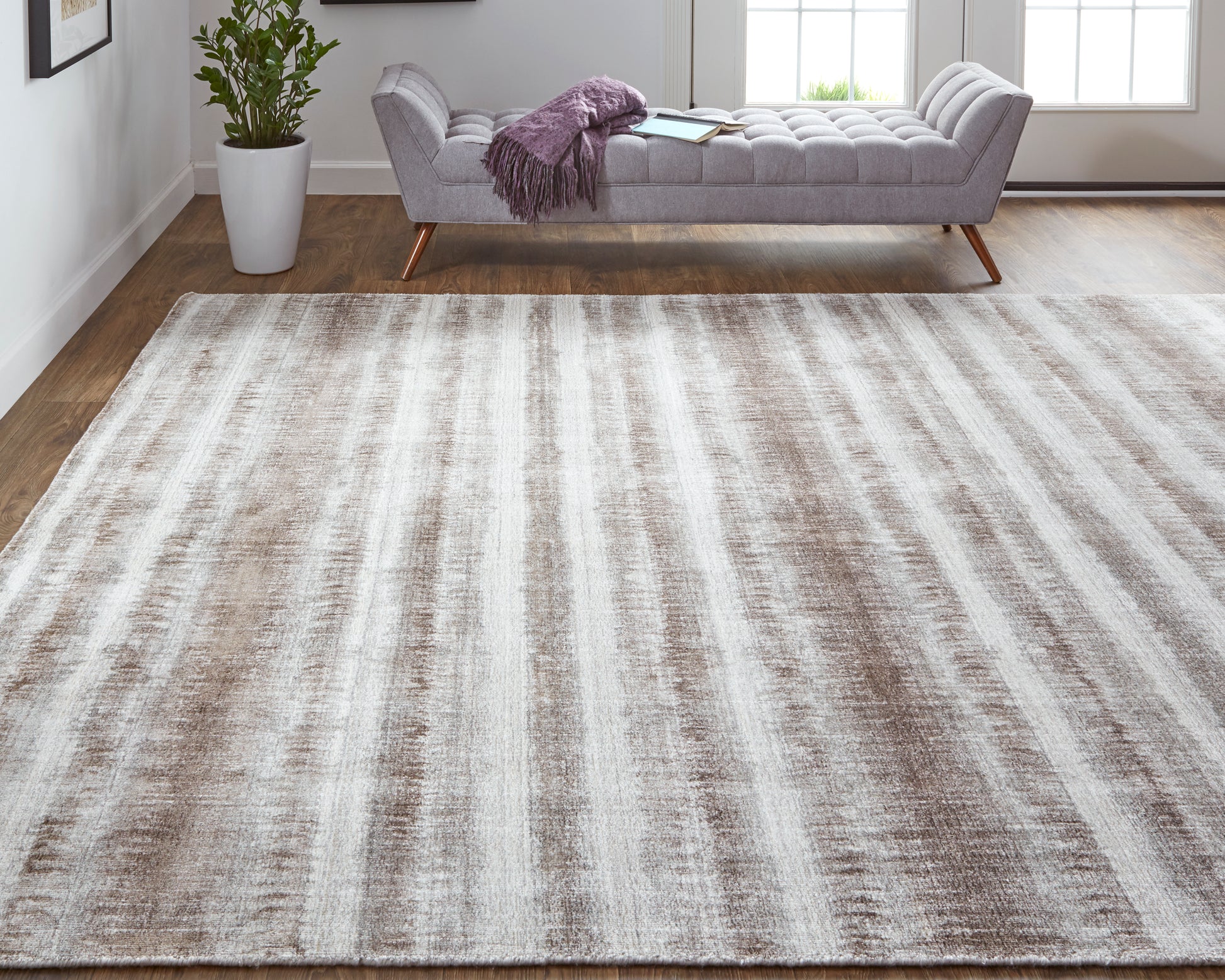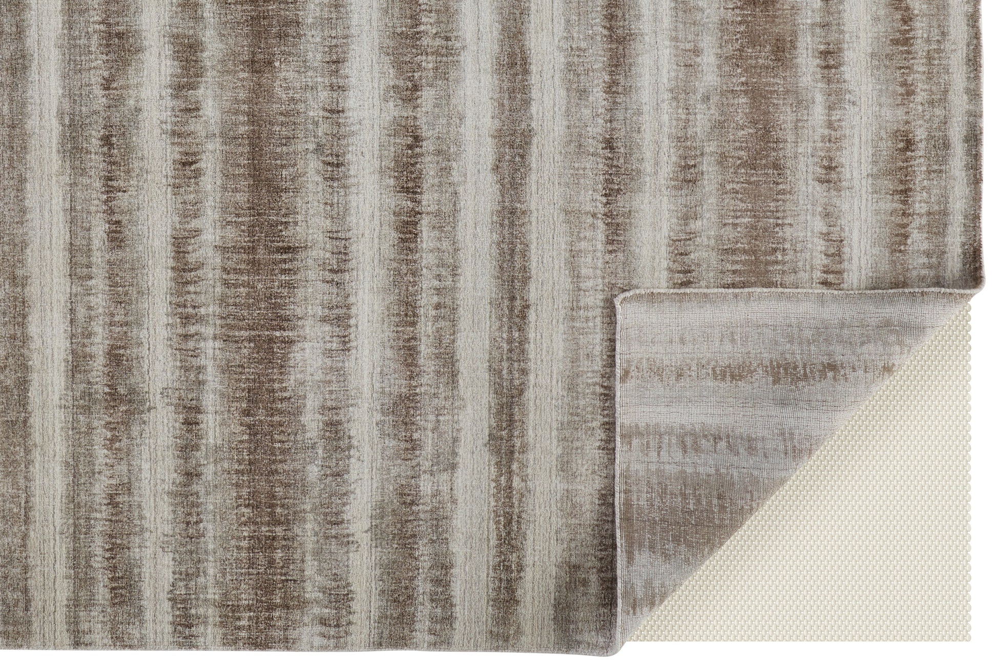 The Feizy Mackay collection is hand woven out of viscose and wool. Made in India, the Mackay has a low pile texture that brings a luxurious sheen and effortless style to any modern space. Instead of being sheared like tufted rugs, woven rug piles are maintained to create an embroidery like texture. Either produced on a hand operated loom, or woven by hand, this method is like hand tufting, but the yarn loops stay intact. The pattern is an artful spin on the classic stripe.