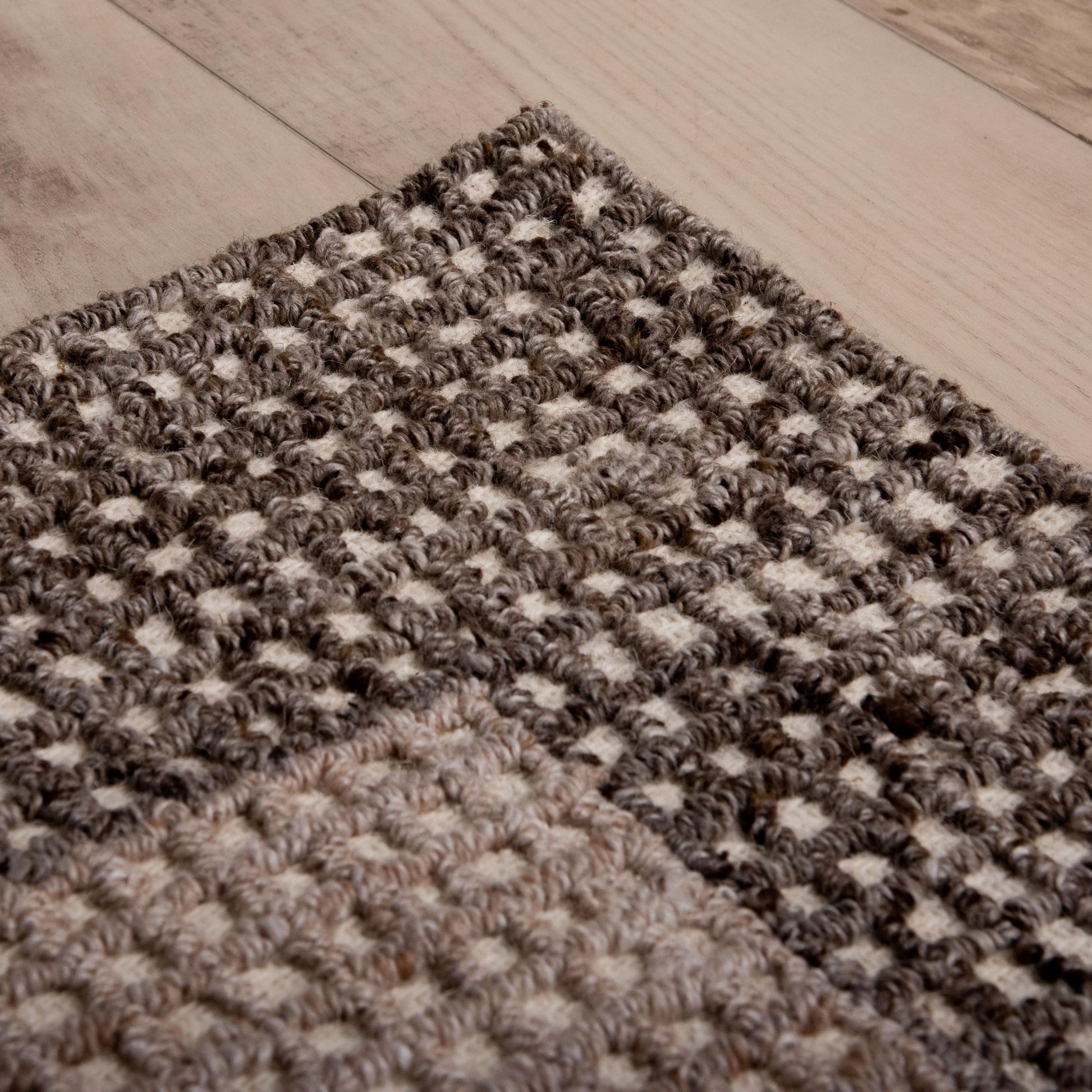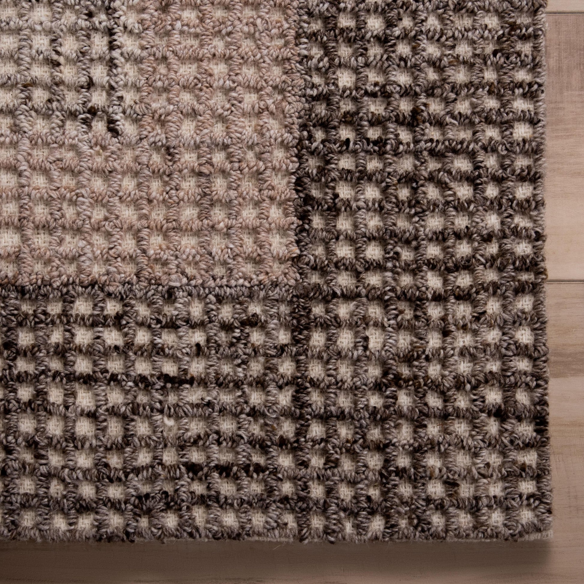 The Slate Collection rug by Rizzy Home combines timeless craftsmanship with modern sophistication. Hand-tufted from 100% wool, this rug features a finely detailed pattern of petite, textured loops that create a subtle checkered effect. The intricate design alternates soft beige tones with rich browns, giving the area rug a dynamic two-tone depth that feels both dimensional and understated. Framed by a contrasting border, its full loop pile and hand-serged edges provide a polished finish. Perfect for modern and transitional spaces, this rug’s versatile style makes it an elegant foundation for any room