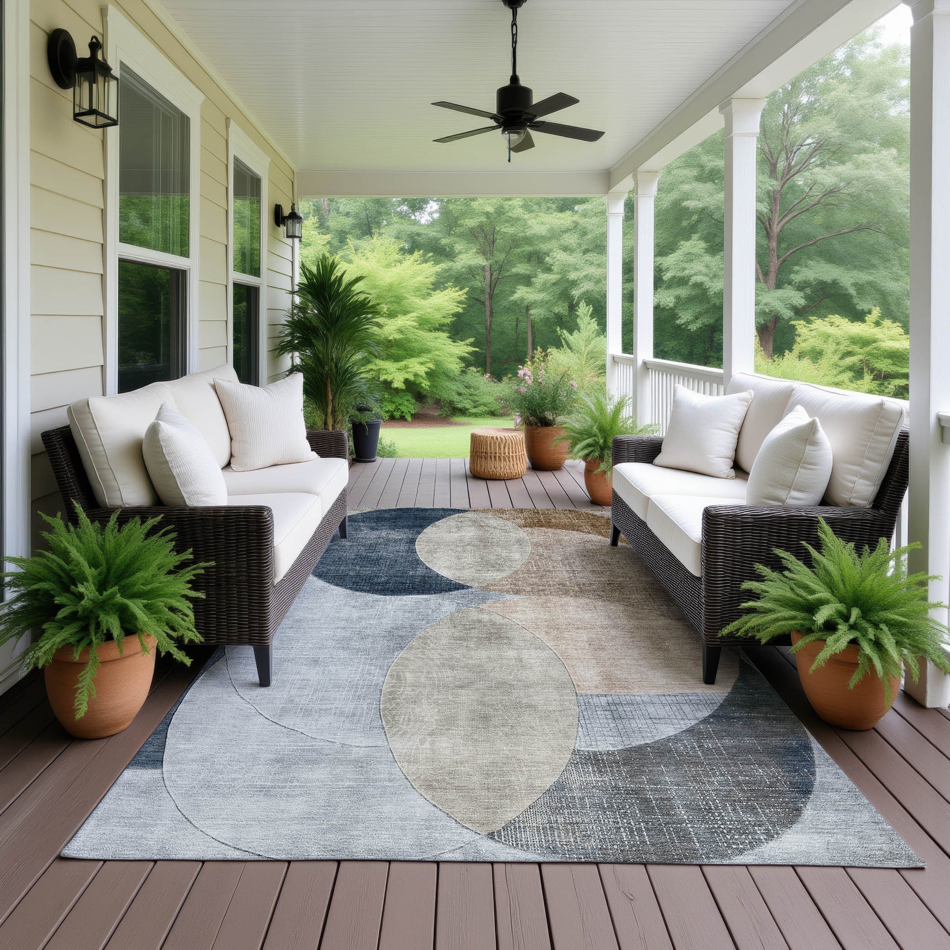 UV stabilized for indoor or outdoor use. All rugs exposed to long periods of intense and direct sunlight can experience loss of color over time. Our rugs perform best in covered outdoor areas and uncovered areas with lower hours of direct sunlight.