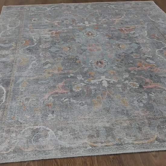 Boasts a transitional medallion pattern with distressing in a palette of blue, gray, taupe, red, orange, ivory.