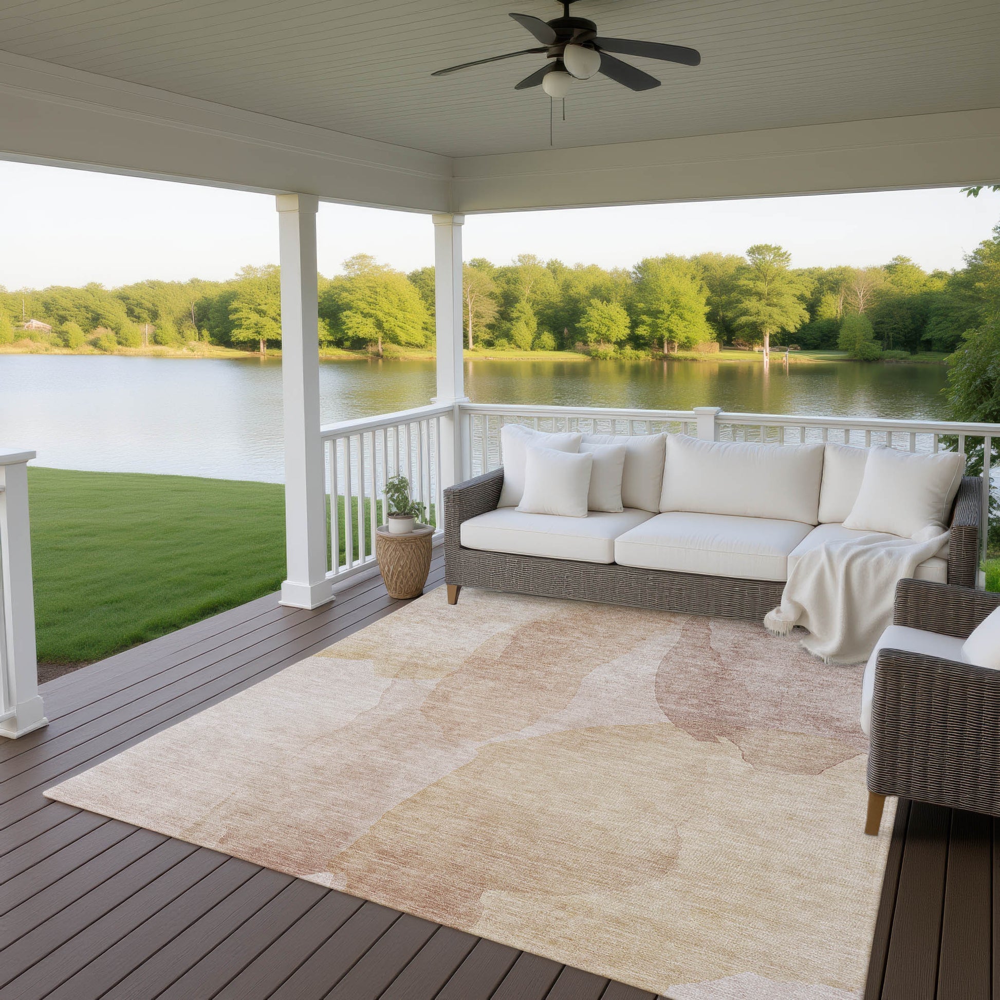 UV stabilized for indoor or outdoor use. All rugs exposed to long periods of intense and direct sunlight can experience loss of color over time. Our rugs perform best in covered outdoor areas and uncovered areas with lower hours of direct sunlight.