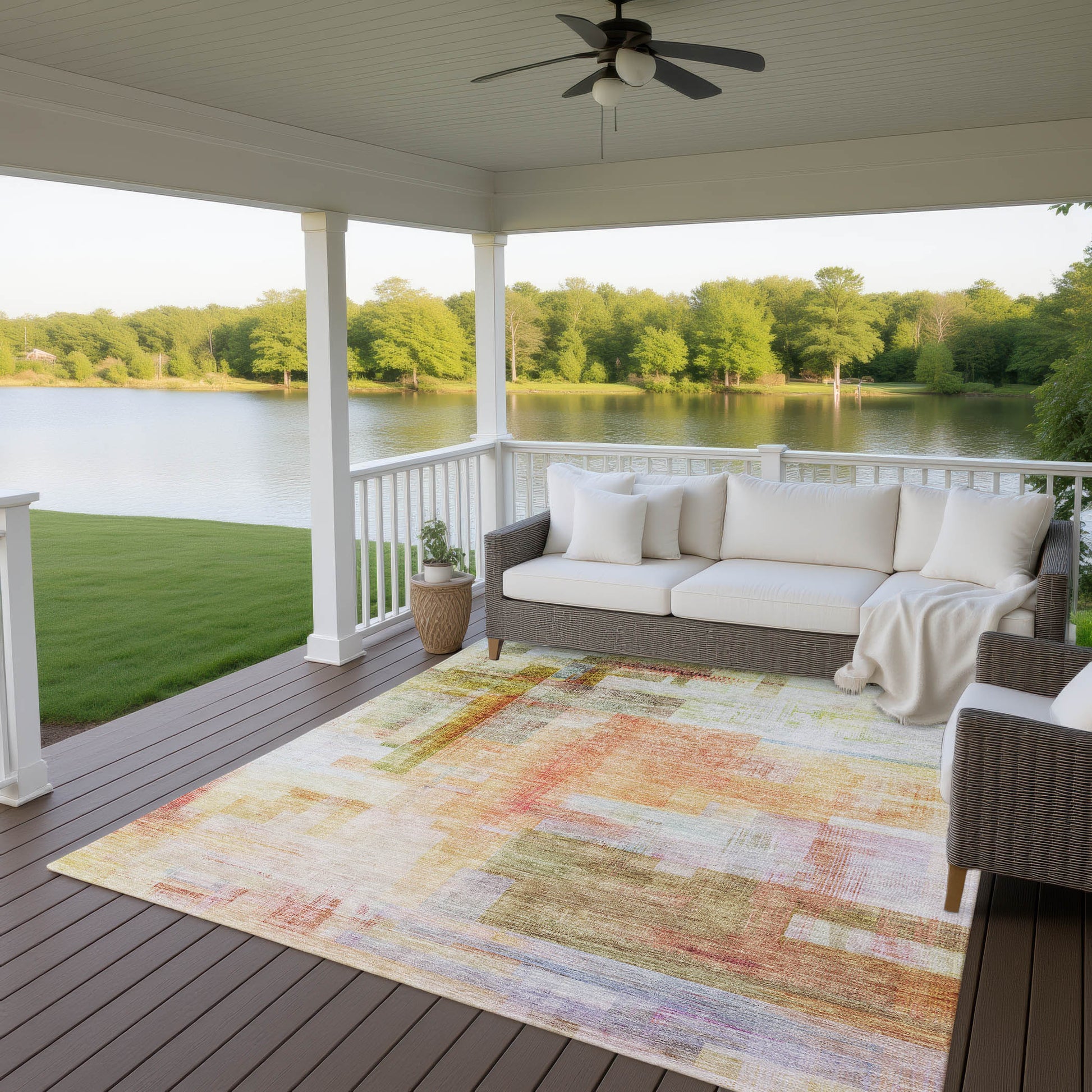 UV stabilized for indoor or outdoor use. All rugs exposed to long periods of intense and direct sunlight can experience loss of color over time. Our rugs perform best in covered outdoor areas and uncovered areas with lower hours of direct sunlight.