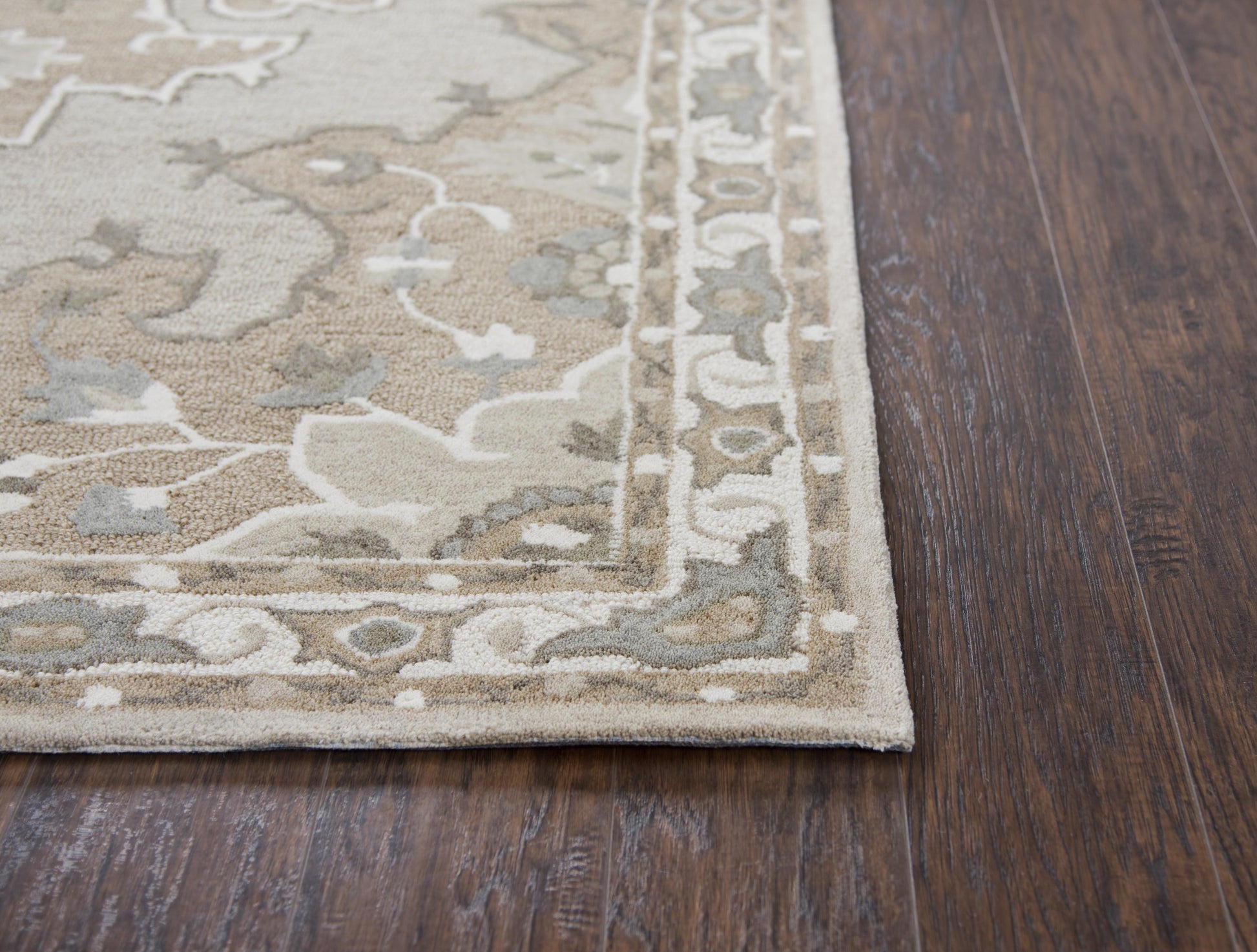 Add a layer of warmth and style to your space with the Rizzy Home Resonant central medallion rug. This floor piece makes a statement with the classic Persian/ transitional style in shades of taupe, grey, and ivory. It was meticulously hand tufted from wool which offers it a unique charm and great comfortability.
