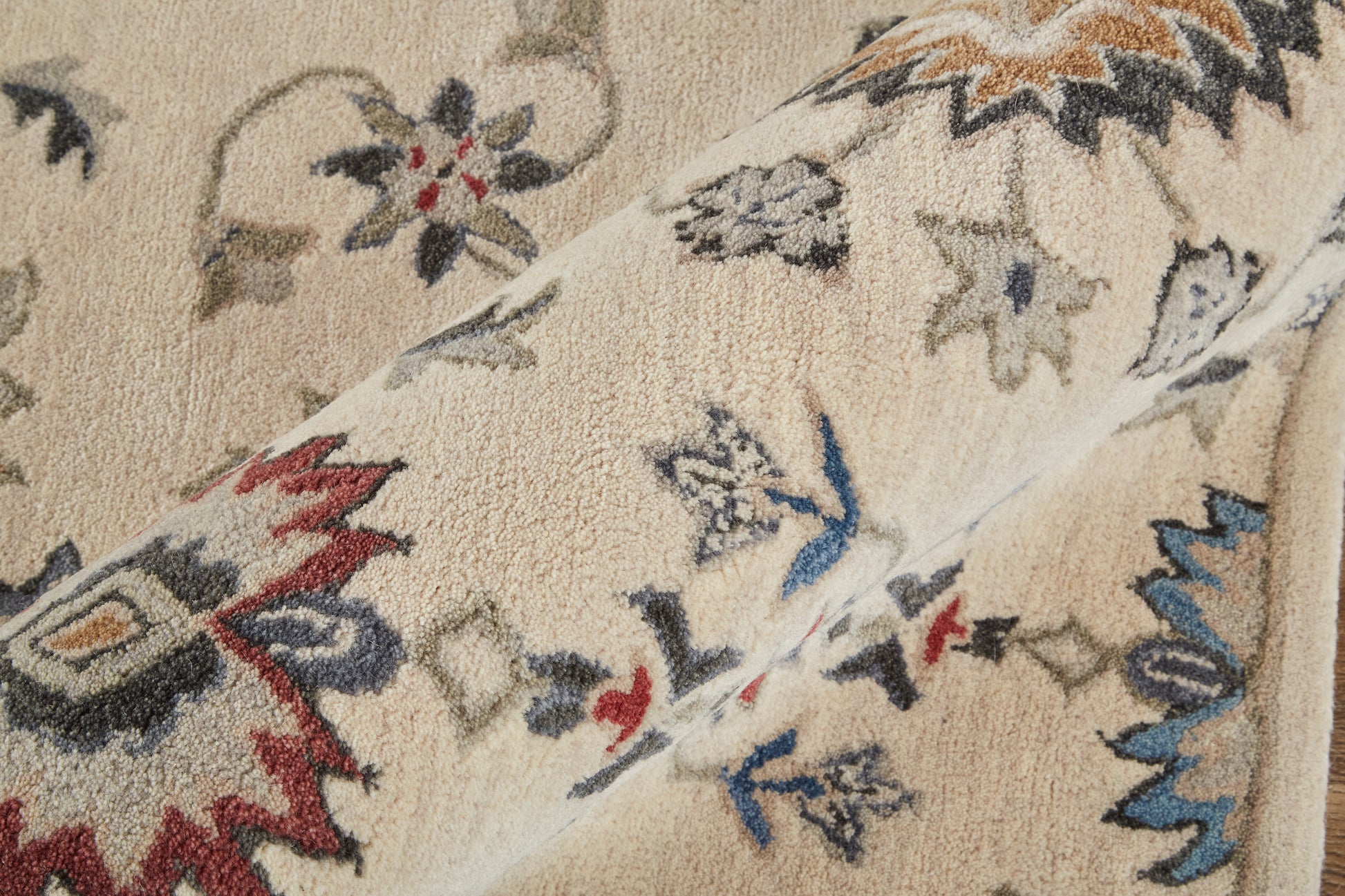 Experience the illustrious pomp and circumstance of the all - wool hand - tufted Rylan Collection. Each piece boasts brilliantly cheeky floral designs as they mingle amidst meandering vines. The trend - forward parade of cool hues feature blue, brown and gray tones with subtle hints of warm reds that create a thoughtfully crafted transitional statement piece.