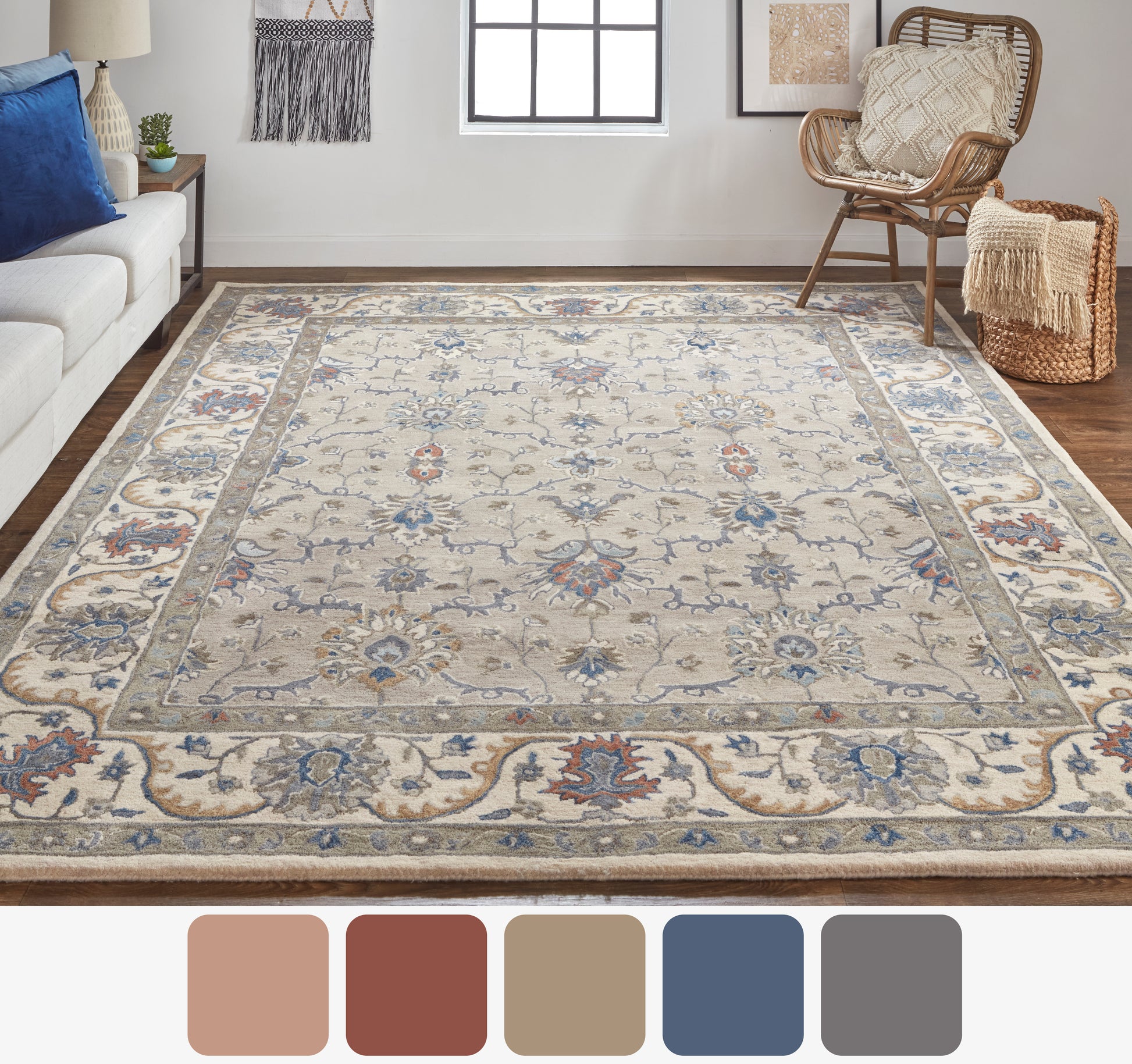 Experience the illustrious pomp and circumstance of the all - wool hand - tufted Rylan Collection. Each piece boasts brilliantly cheeky floral designs as they mingle amidst meandering vines. The trend - forward parade of cool hues feature blue, brown and gray tones with subtle hints of warm reds that create a thoughtfully crafted transitional statement piece.