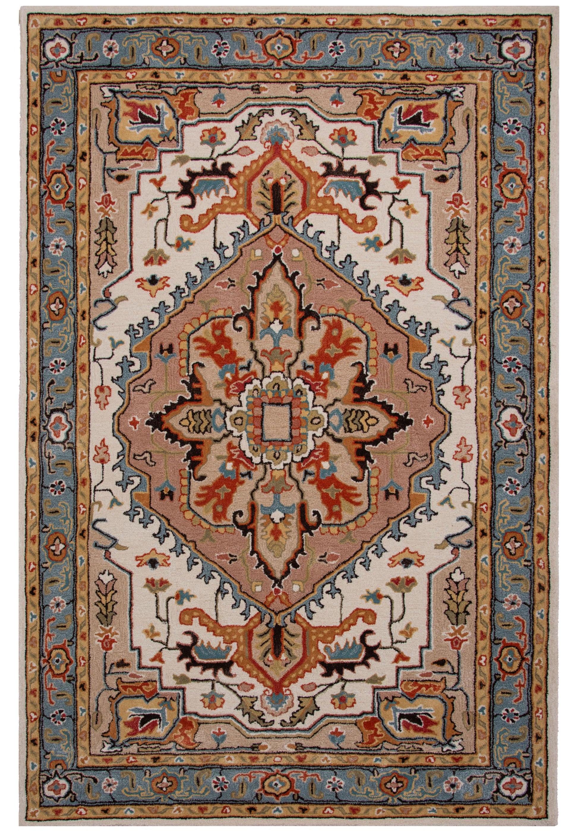 From Rizzy Home's Sapphire Collection, this rug boasts a classic medallion design, bordered by intricate patterns, blending traditional charm with transitional appeal. The captivating design seamlessly merges antique style with modern elegance, making it a statement piece in rich color and personality. Style elevation made simple, this rug is where timeless elegance meets modern allure. Hand-tufted with precision and care, this rug features a luxurious cut pile that exudes comfort and softness underfoot. Meticulously crafted from a blend of tencel and wool, it promises both durability and a gorgeous sheen that catches the eye in the light. The vibrant colorway of red, light blue, navy, orange, beige, and ivory, creates a symphony of rich colors that effortlessly enhances the ambiance in any refined décor.