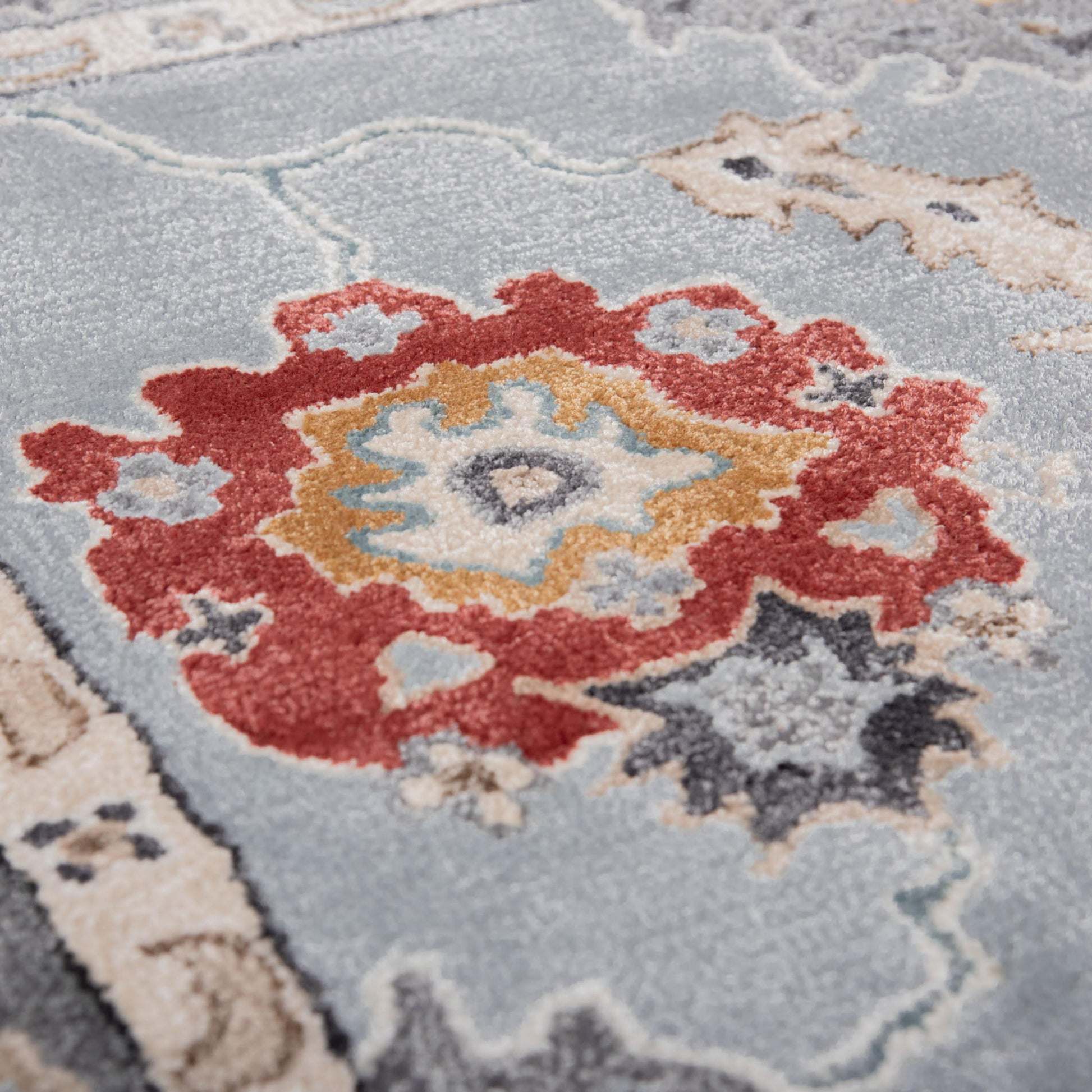 From Rizzy Home's Sapphire Collection, this rug boasts a classic medallion design, bordered by intricate patterns, blending traditional charm with transitional appeal. The captivating design seamlessly merges antique style with modern elegance, making it a statement piece in rich color and personality. Style elevation made simple, this rug is where timeless elegance meets modern allure. Hand-tufted with precision and care, this rug features a luxurious cut pile that exudes comfort and softness underfoot. Meticulously crafted from a blend of tencel and wool, it promises both durability and a gorgeous sheen that catches the eye in the light. The vibrant colorway of red, light blue, navy, orange, beige, and ivory, creates a symphony of rich colors that effortlessly enhances the ambiance in any refined décor.