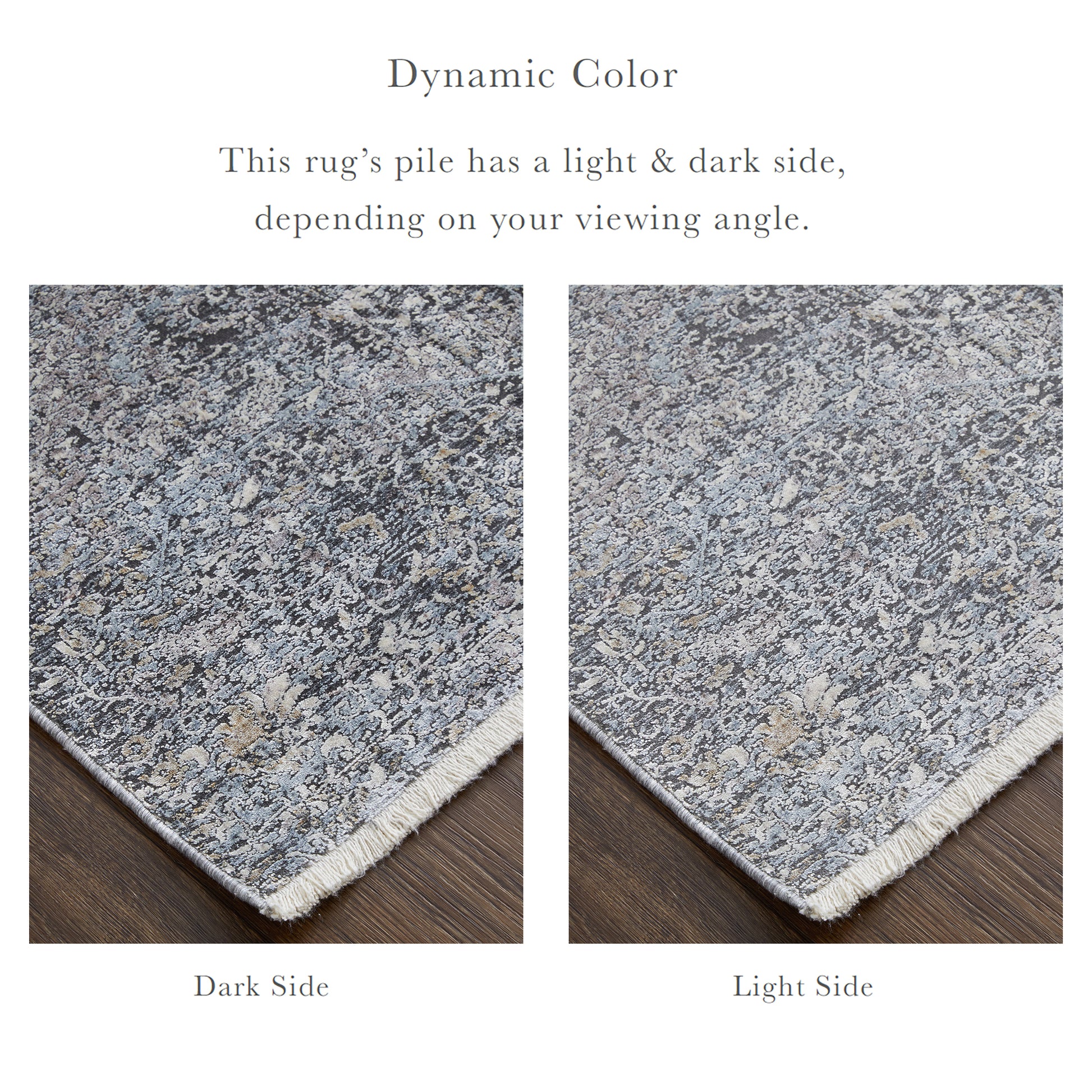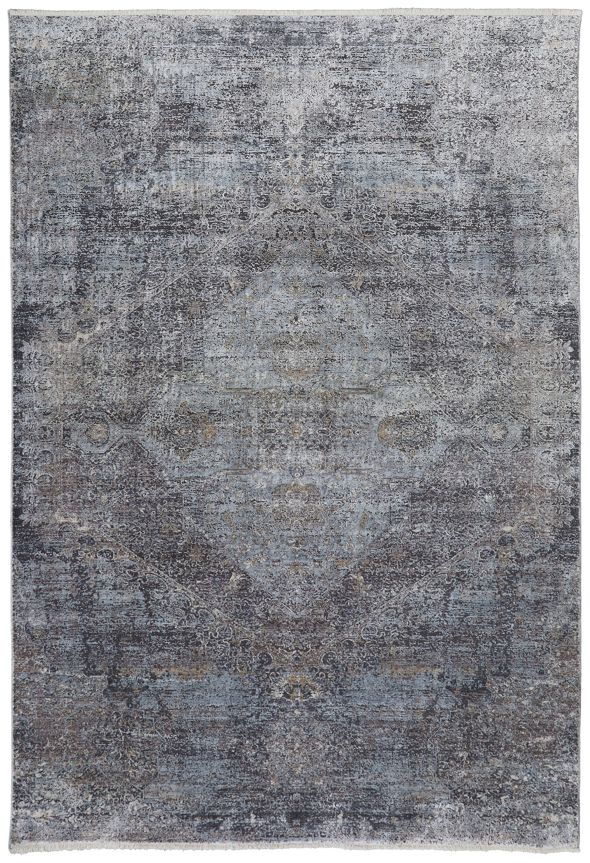 The Feizy Sarrant collection is machine made in a luminous viscose and polyester blend showcase traditional medallion motifs. The ultra-dense machine woven piles give these pieces added durability with a soft touch. Power loomed in Turkey of luminous space-dyed viscose these decadent pieces feature color gradients of charcoal and ivory and are accented with delicate notes of soothing blues and warm yellows.
