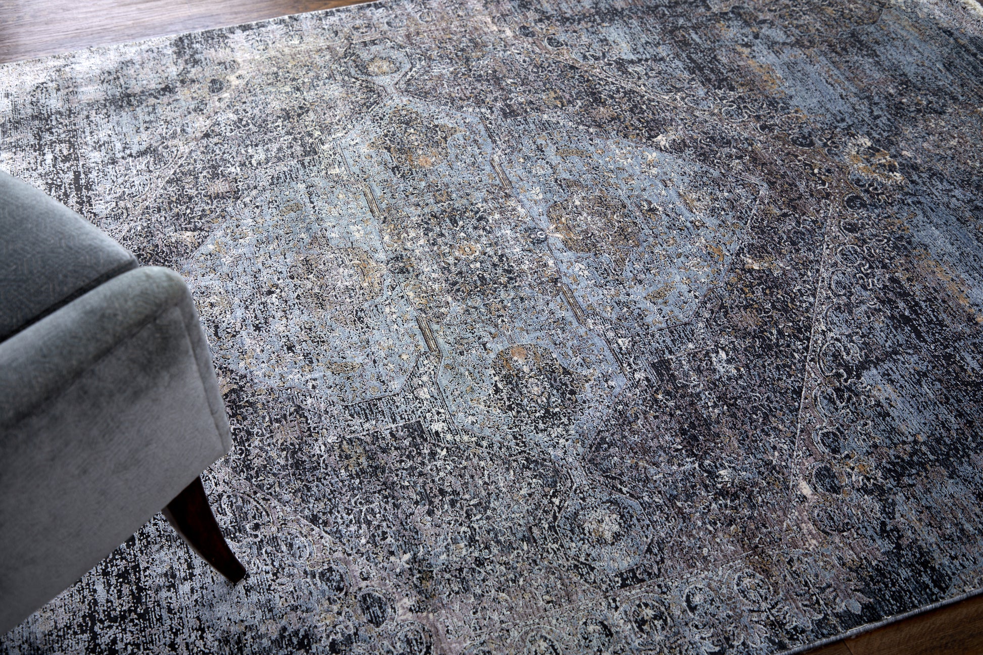 The Feizy Sarrant collection is machine made in a luminous viscose and polyester blend showcase traditional medallion motifs. The ultra-dense machine woven piles give these pieces added durability with a soft touch. Power loomed in Turkey of luminous space-dyed viscose these decadent pieces feature color gradients of charcoal and ivory and are accented with delicate notes of soothing blues and warm yellows.