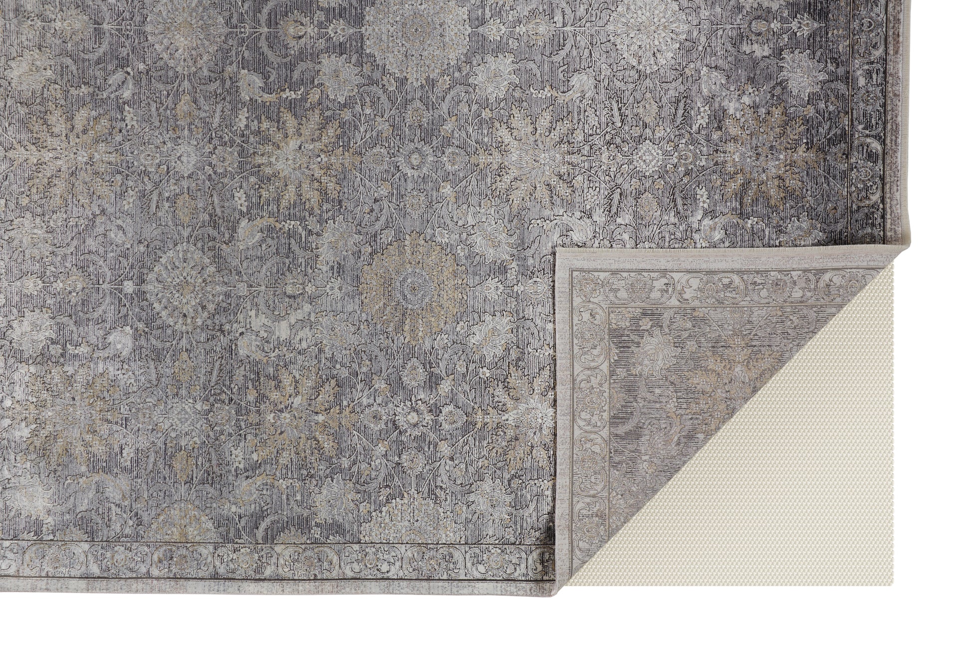The Feizy Sarrant collection is machine made in a luminous viscose and polyester blend showcase traditional medallion motifs. The ultra-dense machine woven piles give these pieces added durability with a soft touch. Power loomed in Turkey of luminous space-dyed viscose these decadent pieces feature color gradients of charcoal and ivory and are accented with delicate notes of soothing blues and warm yellows.