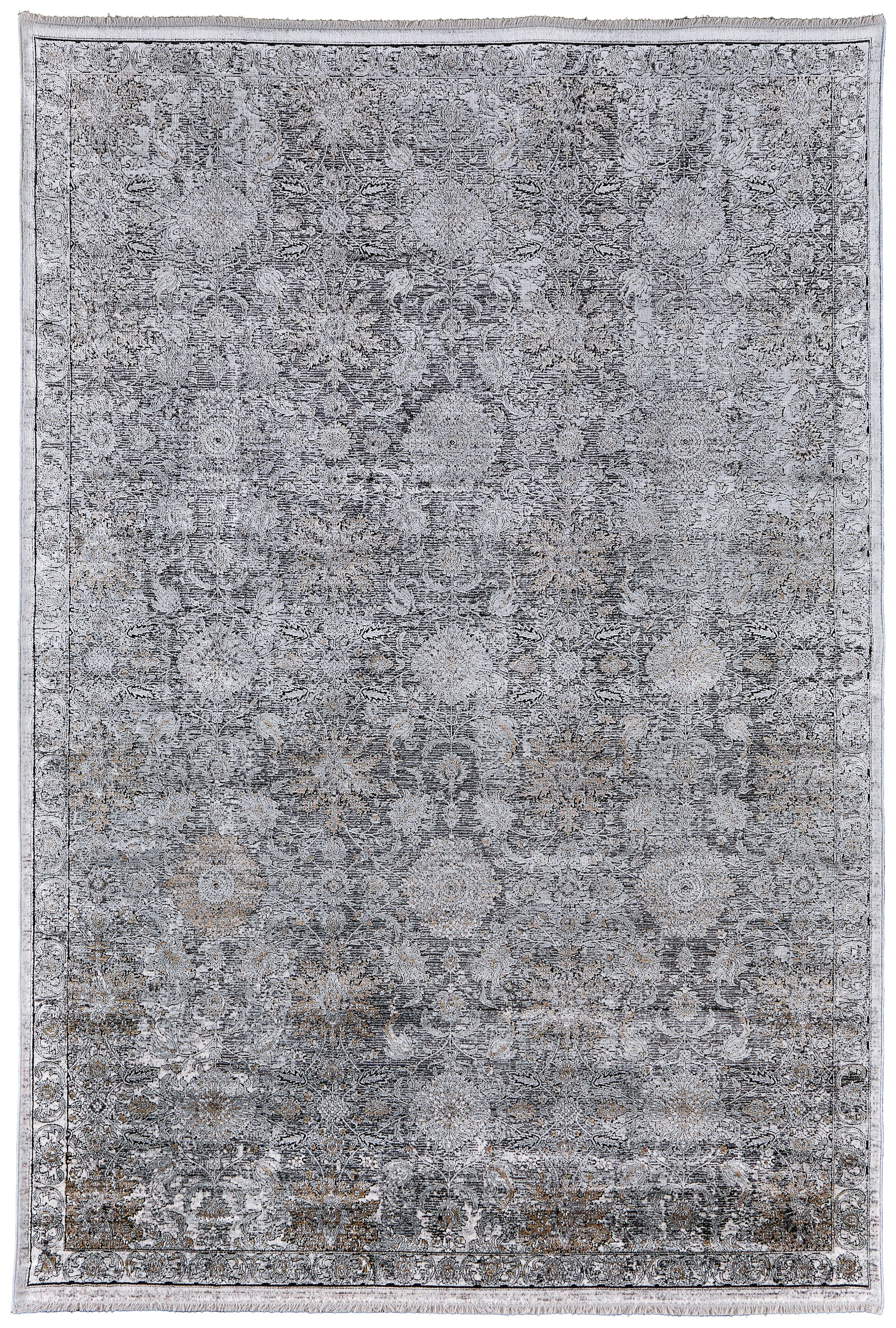 The Feizy Sarrant collection is machine made in a luminous viscose and polyester blend showcase traditional medallion motifs. The ultra-dense machine woven piles give these pieces added durability with a soft touch. Power loomed in Turkey of luminous space-dyed viscose these decadent pieces feature color gradients of charcoal and ivory and are accented with delicate notes of soothing blues and warm yellows.