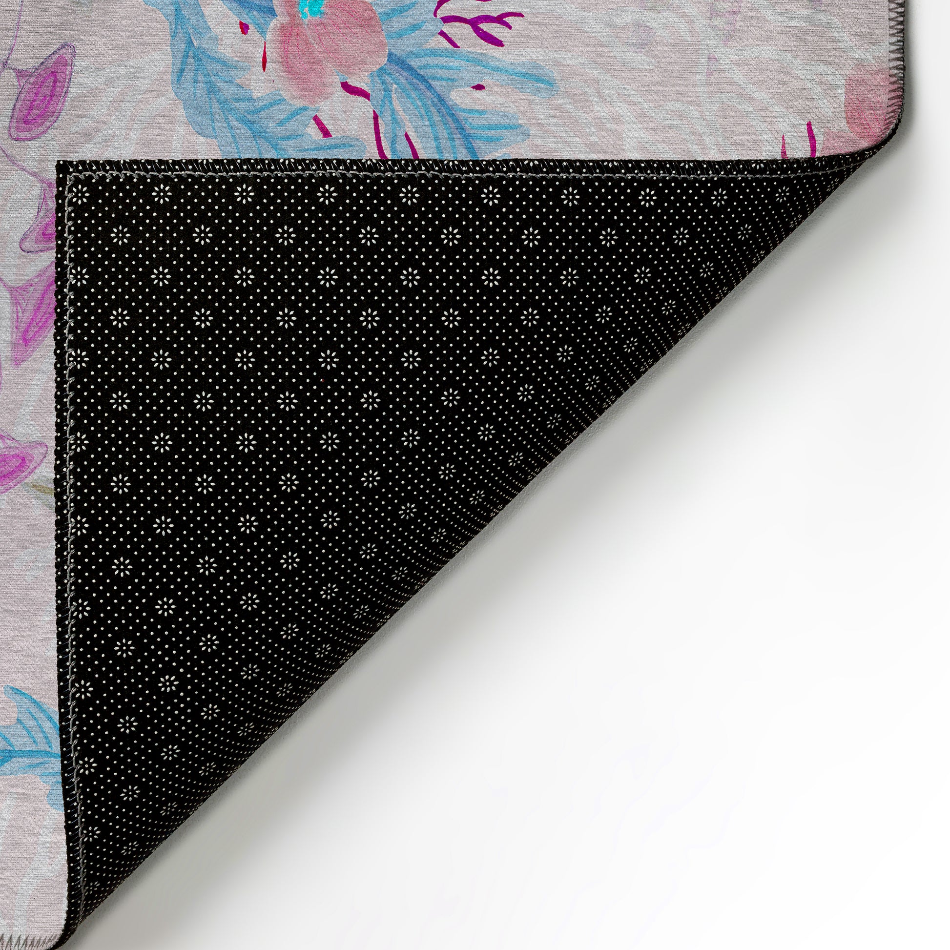 Ultra thin polyester flat woven construction with an incorporated non-skid backing. A separate rug pad may be used for added cushion and support.