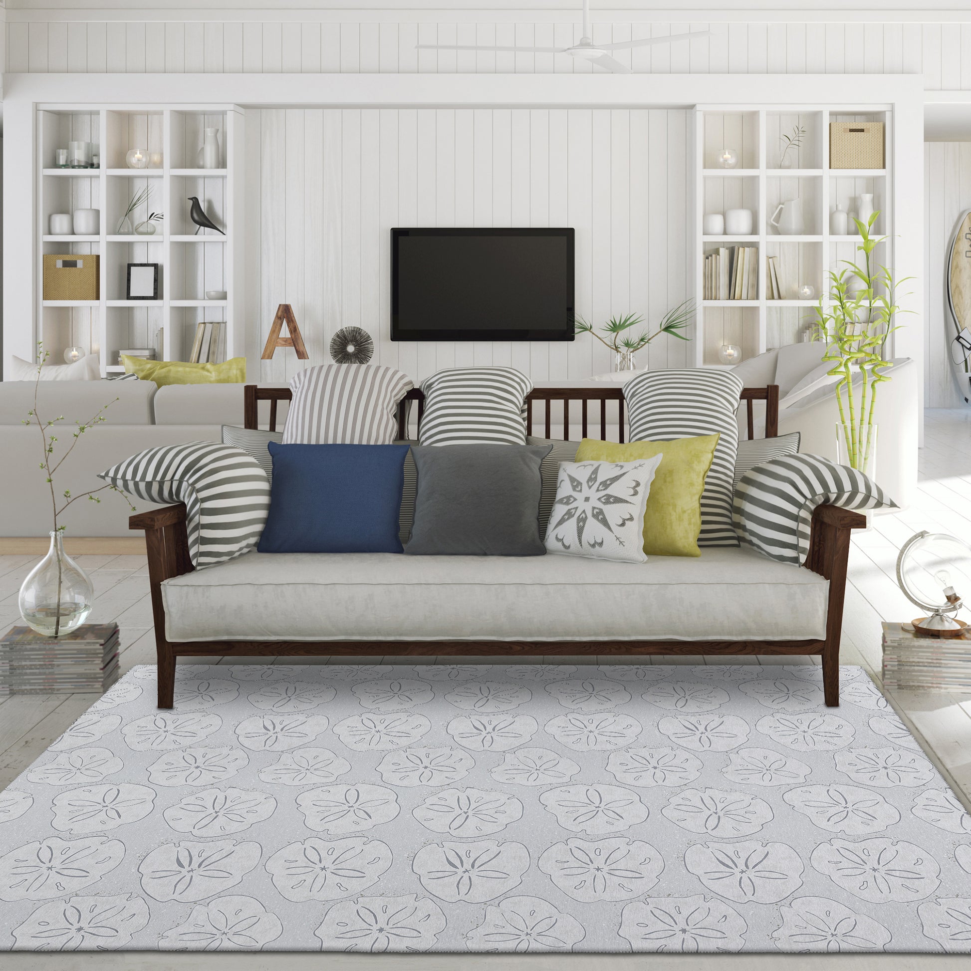 Remarkable Seabreeze collection has been created to inspire tranquility. Wow your guests with these versatile casual coastal rugs, stylish flat weave rug features vibrant colors with gradient movement in a variety of natural beach mosaic shapes and patterns. Featuring an ultra-soft and ultra thin pile, each rug is made with 100% polyester pile complete with a non-skid backing. Final crafting in USA using domestic processing on an imported substrate. They are UV Stabilized for indoor and cover outdoor spaces. Shake out or use straight suction with vacuum, do not use a beater bar. Machine washable in cold water and air dry, some sizes may be too large for a residential washing machine and is family and pet friendly.