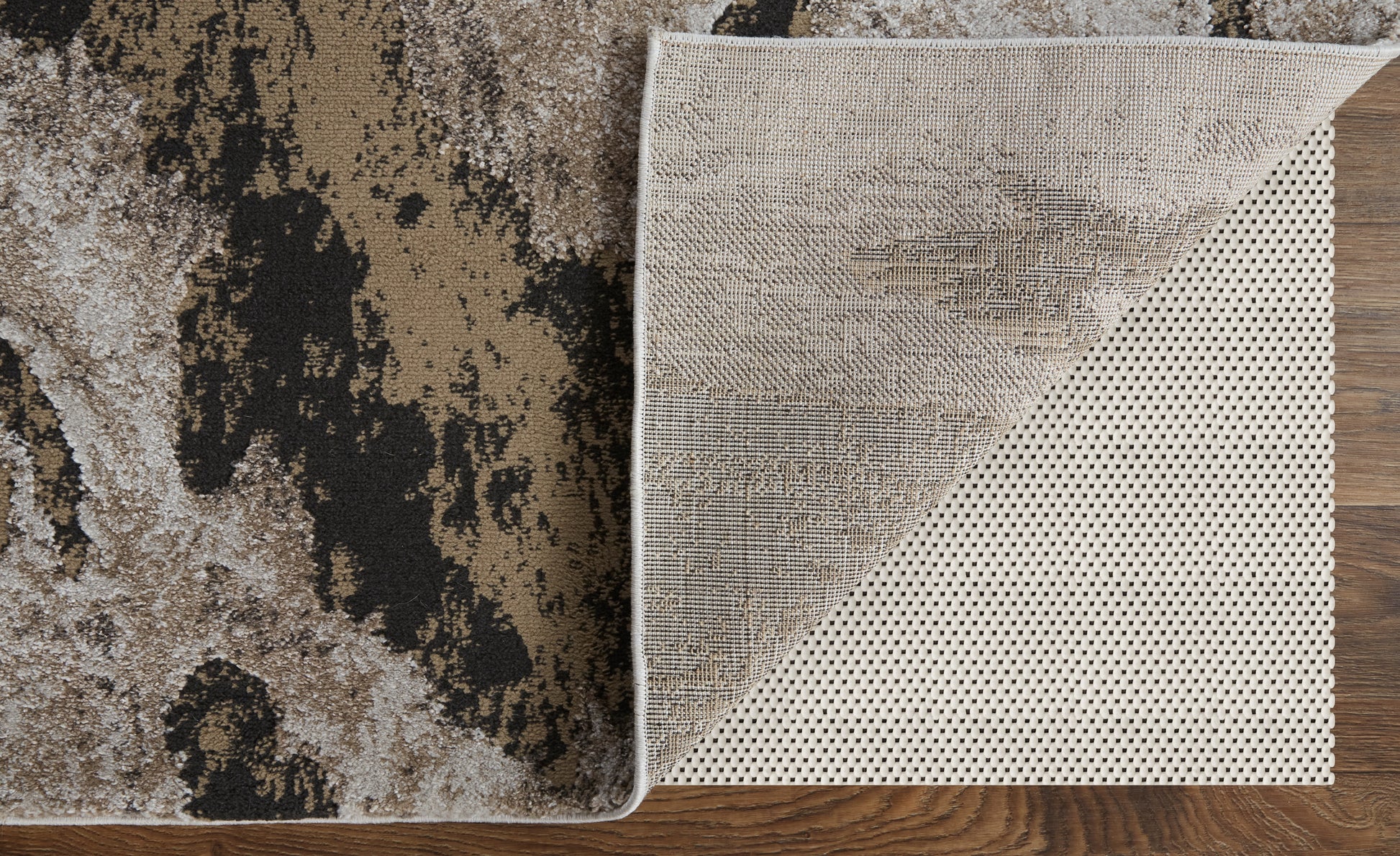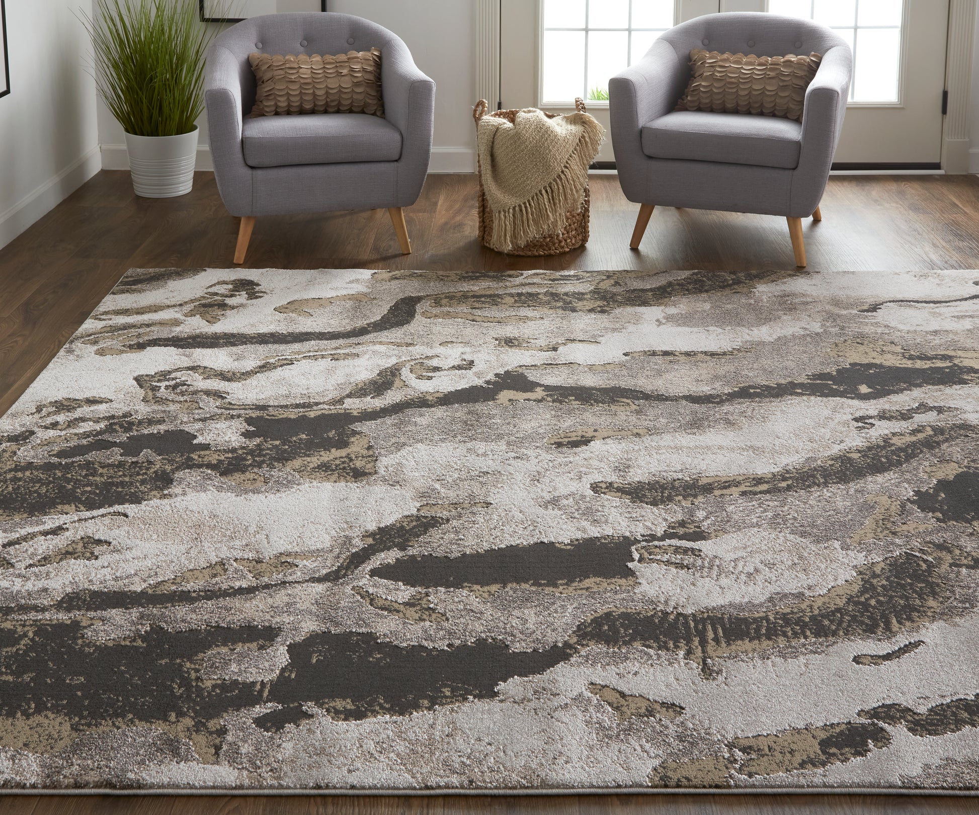 The rug showcases a contemporary design with abstract, watercolor, and geometric motifs in a neutral color scheme.