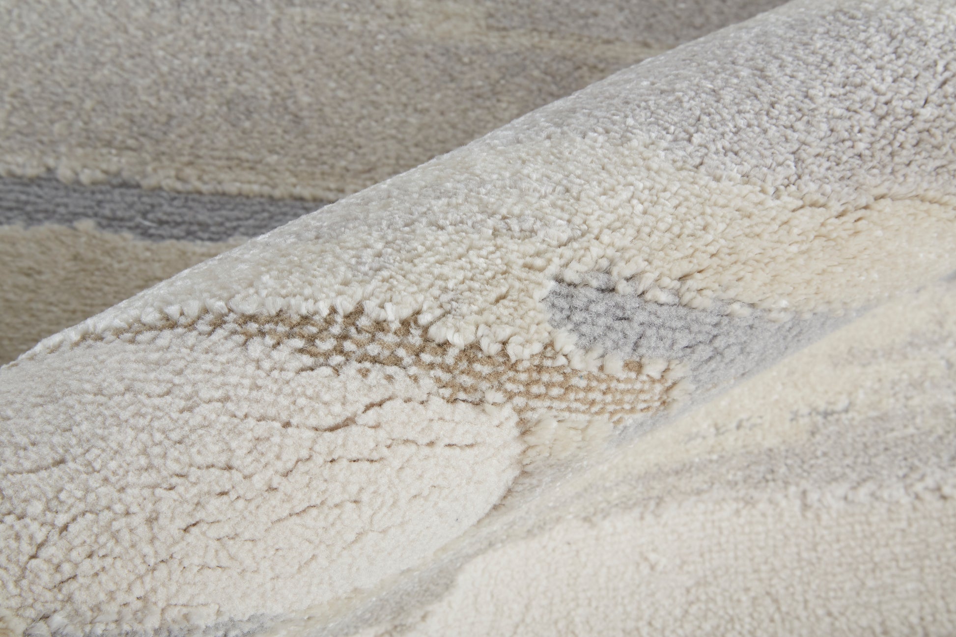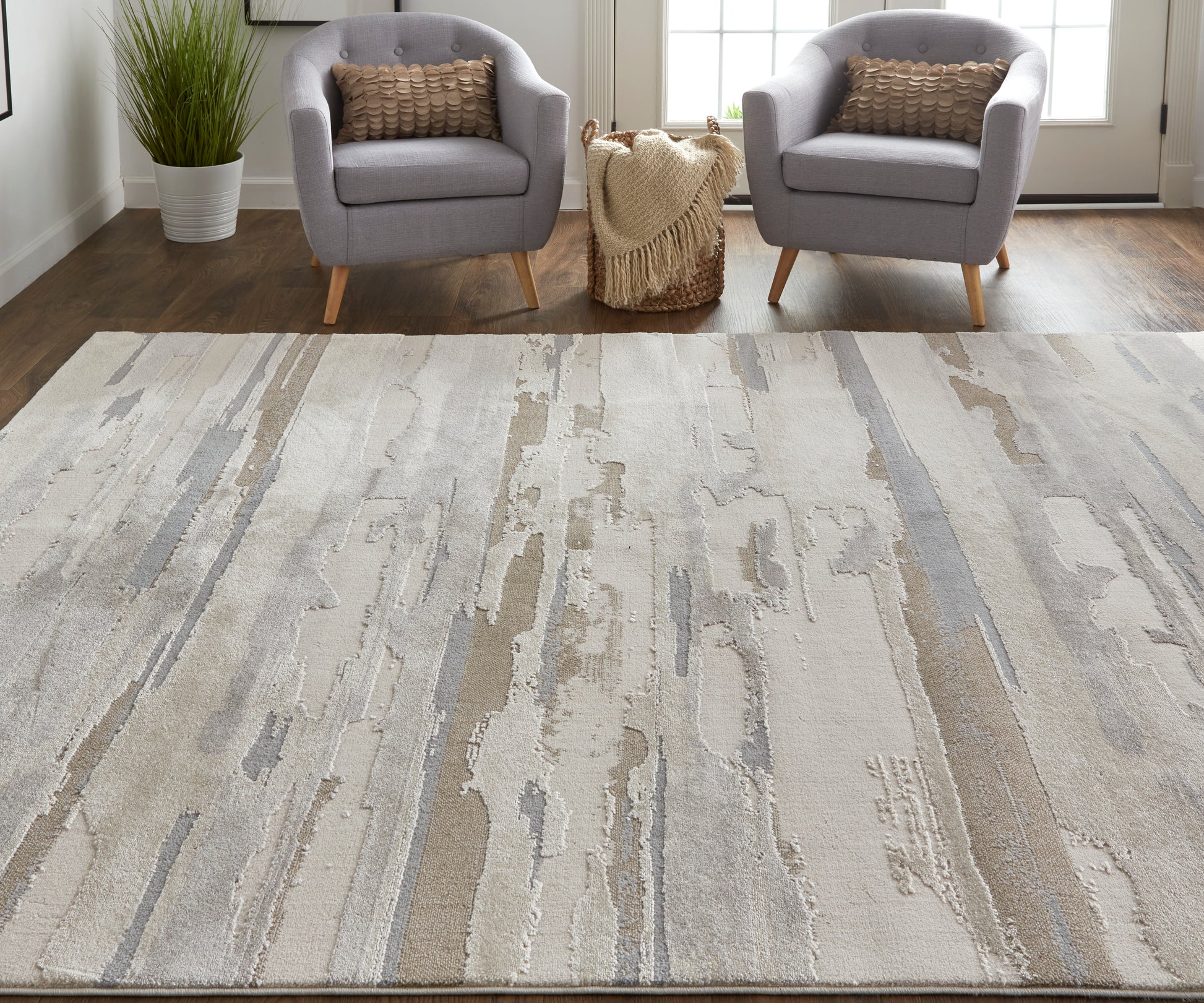 The rug showcases a contemporary design with abstract, watercolor, and geometric motifs in a neutral color scheme.