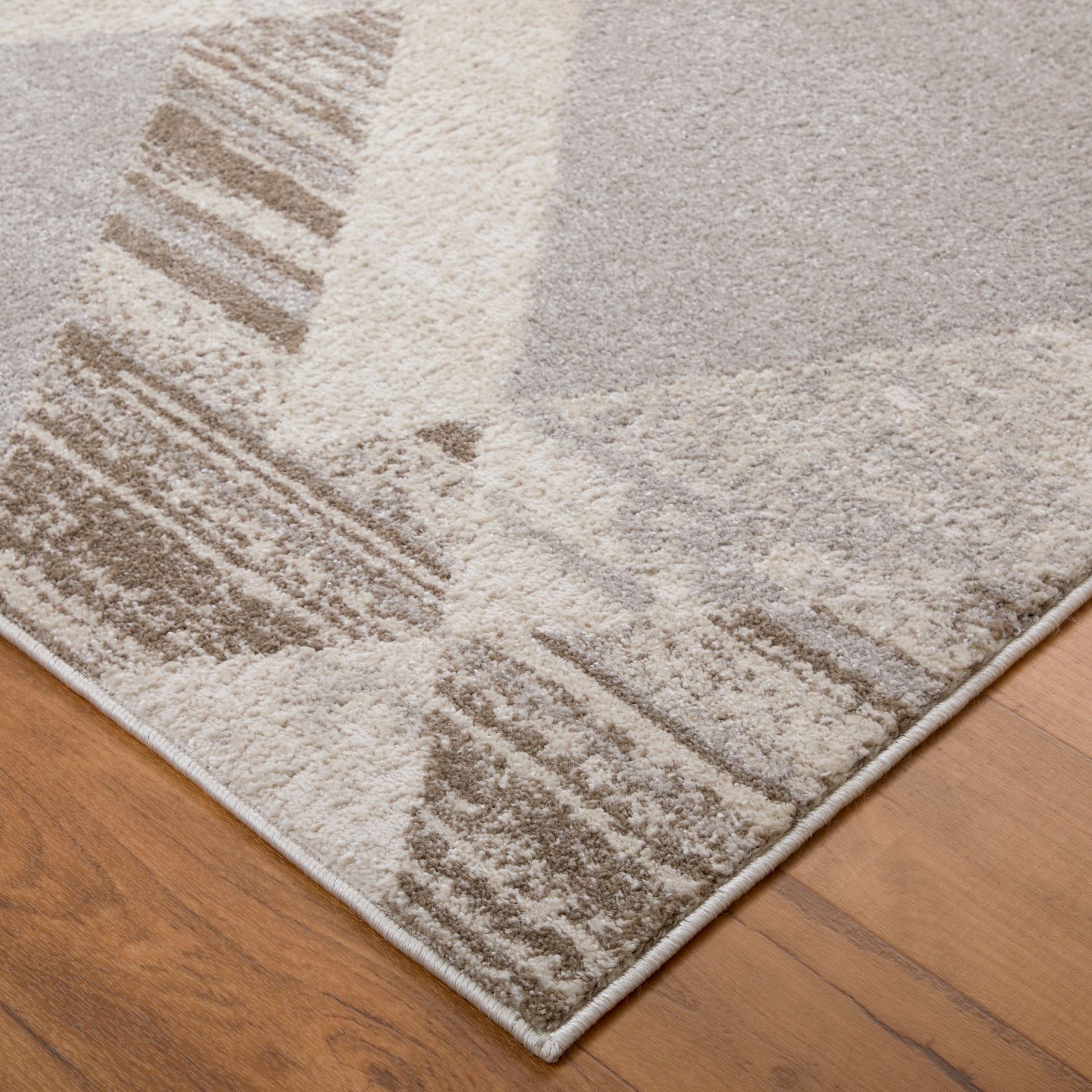 The rug showcases a contemporary design with abstract, watercolor, and geometric motifs in a neutral color scheme.