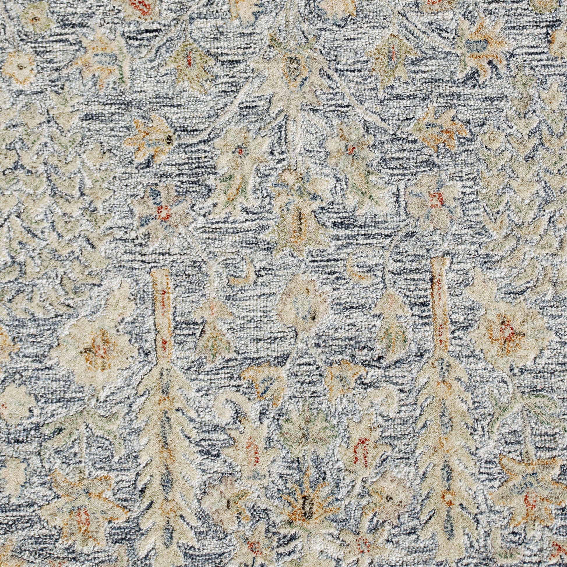 Elements of abstract garden motifs and distressed floral design meld together to create this timeless traditional area rug. This wool rug features a modest array of neutral colors in shades of blue and ivory with hints of taupe, green, red, and orange. Made for the home with high-traffic spaces, this hand tufted area rug highlights the extravagant look and feel of a vintage wool rug plus with a durable lifespan and affordable price point.